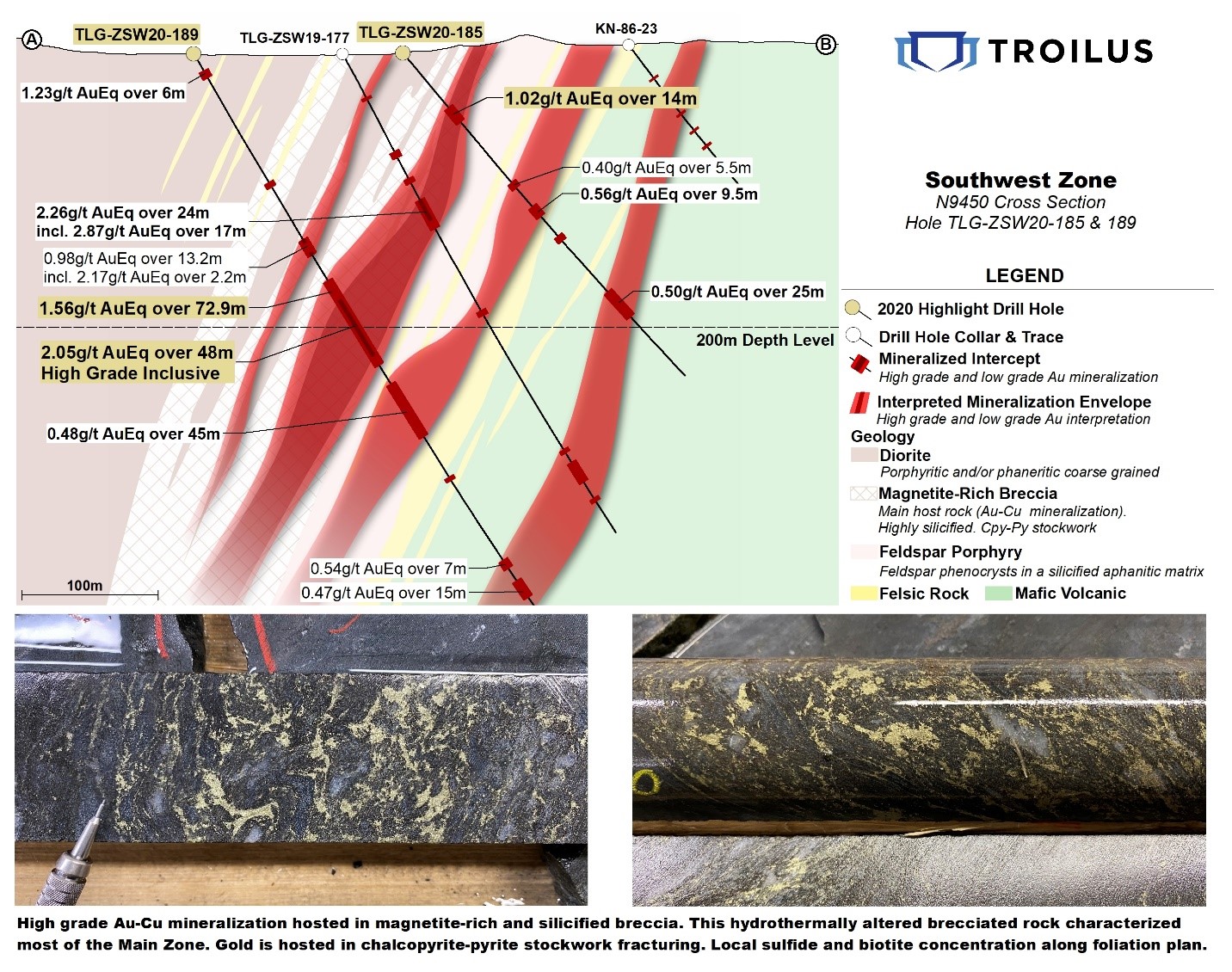Justin Reid, Chief Executive Officer of Troilus commented: “Drill hole TLG-ZSW20-189 is a spectacular stand out, not only from this recent drill program but also in the context of all the drilling that we have completed from the main Z87 and J Zones over the last couple of years and historic drilling from Inmet Mining Corporation  when defining the original Troilus mine.  It demonstrates AuEq mineralization grading well over 1 g/t AuEq sustained over material intercepts including one section of 1.56 g/t AuEq over 73 metres.  This mineralization is being encountered at shallow depths and demonstrate technical similarities to Z87, the largest of the Troilus ore bodies.  These results are further evidence that the Southwest Zone could be of considerable scale and have the potential to add to Troilus’ existing mineral resources estimate of 4.71 million ounces of Indicated gold equivalent and 1.76 million ounces of Inferred gold equivalent (see press release dated November 12, 2019).  We believe that the results we are seeing from the Southwest Zone provide further evidence that the Troilus property has the potential to host a large, regional scale gold mineralizing system and remains materially underexplored.  The Troilus team is excited to further expand our knowledge of this system by applying our evolving geological model to this area and the rest of the property.  The Southwest Zone remains open along trend and at depth.”