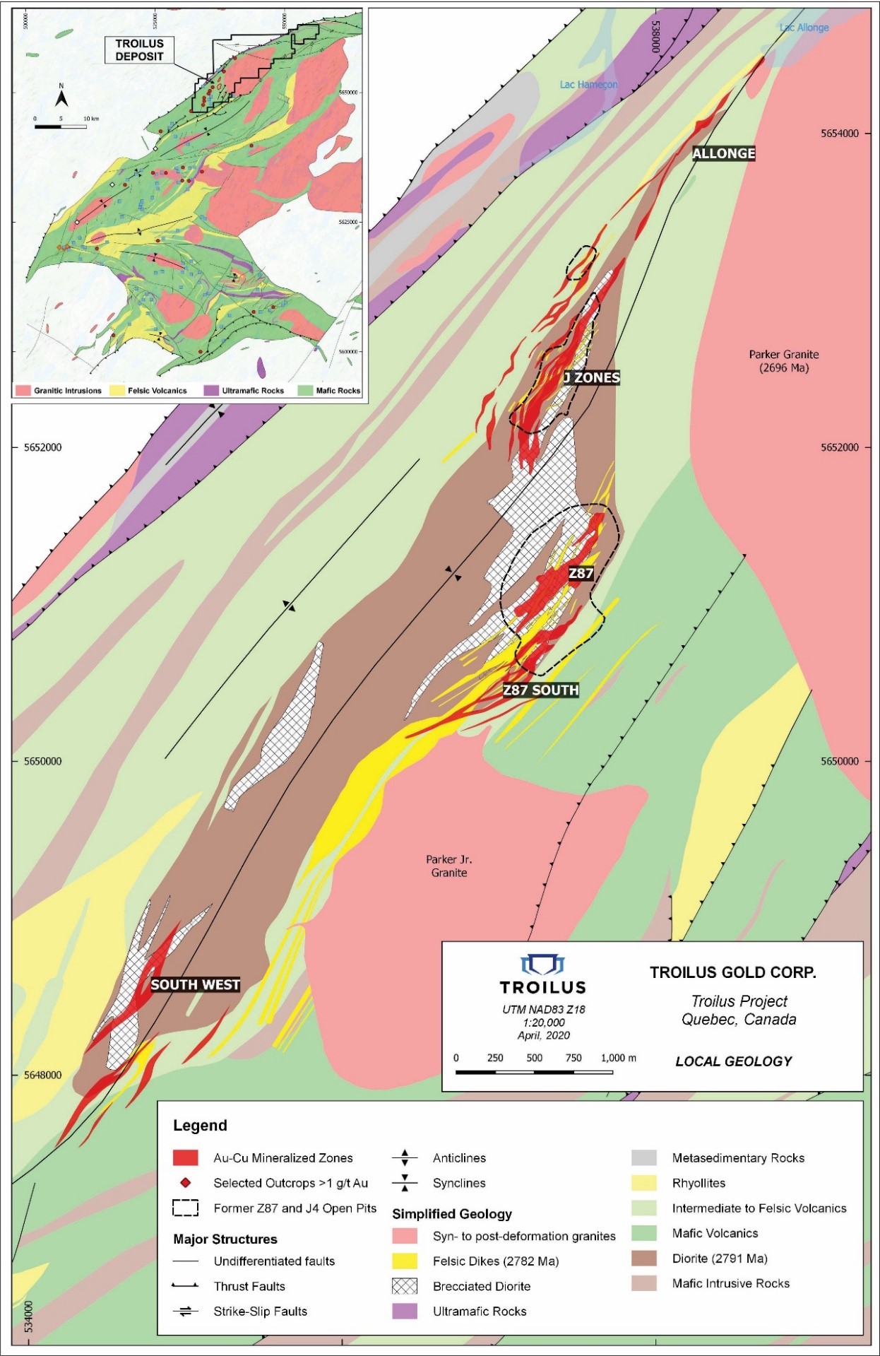 April 21, 2020, Toronto, Ontario – Troilus Gold Corp. (TSX: TLG; OTCQB: CHXMF) (“Troilus” or the “Company”) reports additional results from the 6,000 metre drill program completed earlier this year in the Southwest Zone (the “Southwest Zone” or “SWZ”) at its 100%-owned Troilus property (the “Troilus Project”) located northeast of Chibougamau, Quebec. All drill holes reported herein successfully intersected gold and demonstrated geology similar to the main mineralized zone on the property, Z87, located less than 3.5 kilometres to the northeast of the SWZ (see Figure 2).