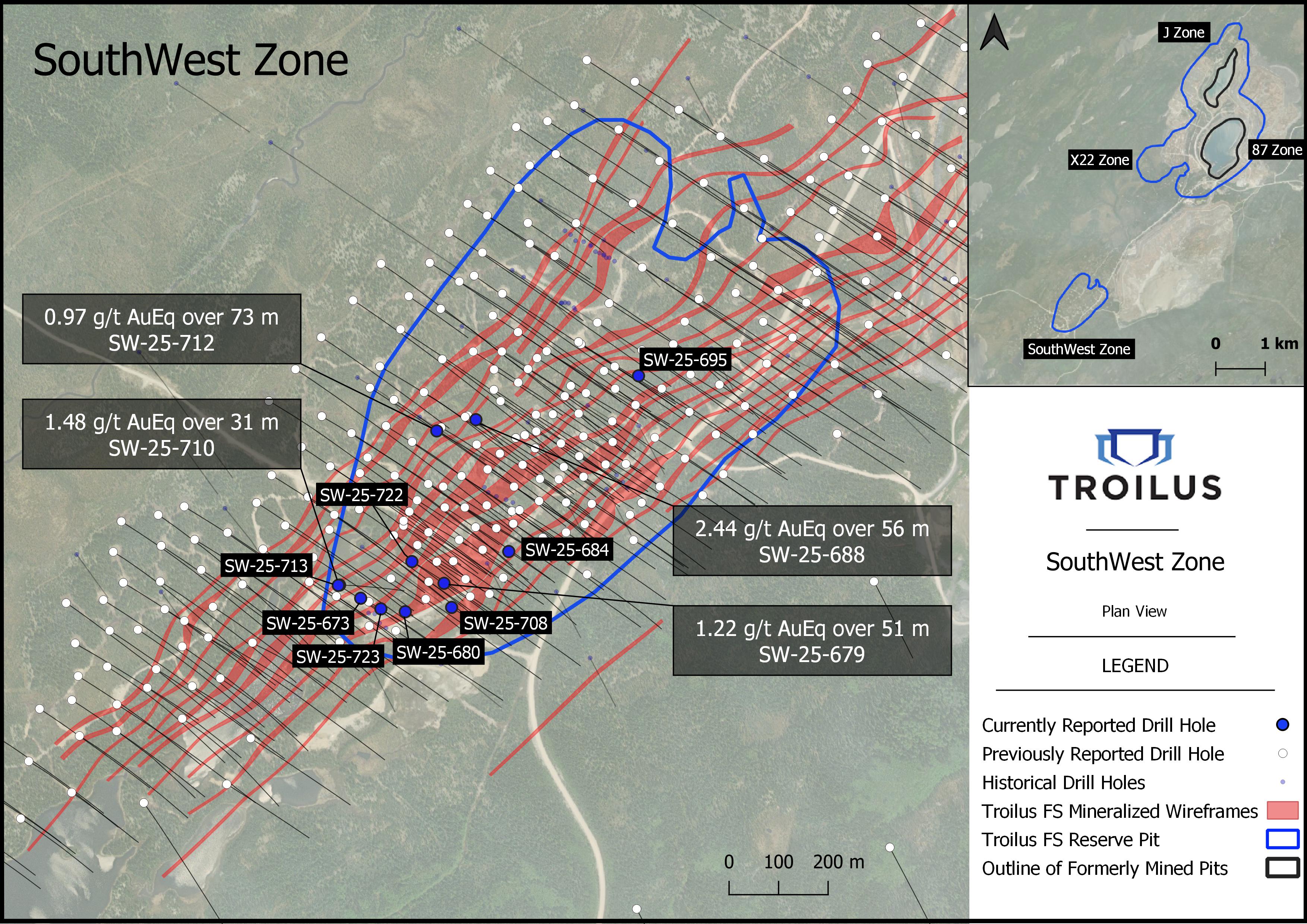 Le programme de forage en cours dans la zone Southwest vise à mieux définir les zones à haute teneur pour les premières années de production. Ces premiers résultats publiés comprennent la meilleure intersection de Troilus dans l'histoire des forages dans la zone Southwest, en termes de teneur linéaire. Le trou SW-25-688 a recoupé 2,44 g/t d’équ.-or sur 56 mètres à partir de la zone enrichie (« ore shoot ») sur laquelle est centrée la fosse de la Phase 1, surpassant ainsi le résultat le plus élevé obtenu précédemment dans la zone Southwest, soit 1,56 g/t d’équ.-or sur 73 mètres dans le trou TLG-ZSW20-189 (voir communiqué de presse du 21 avril 2020).