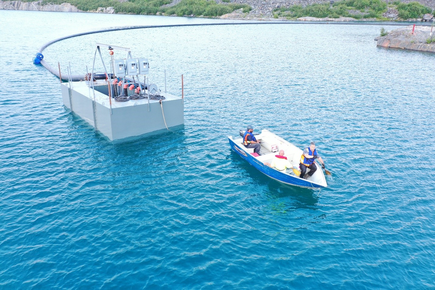 Photo 1 : Les employés de Troilus installent une barge comportant trois pompes de 140 HP dans la fosse J4. L’eau pompée de J4 circule dans une canalisation pour être traitée avant d’être libérée dans le milieu environnant.