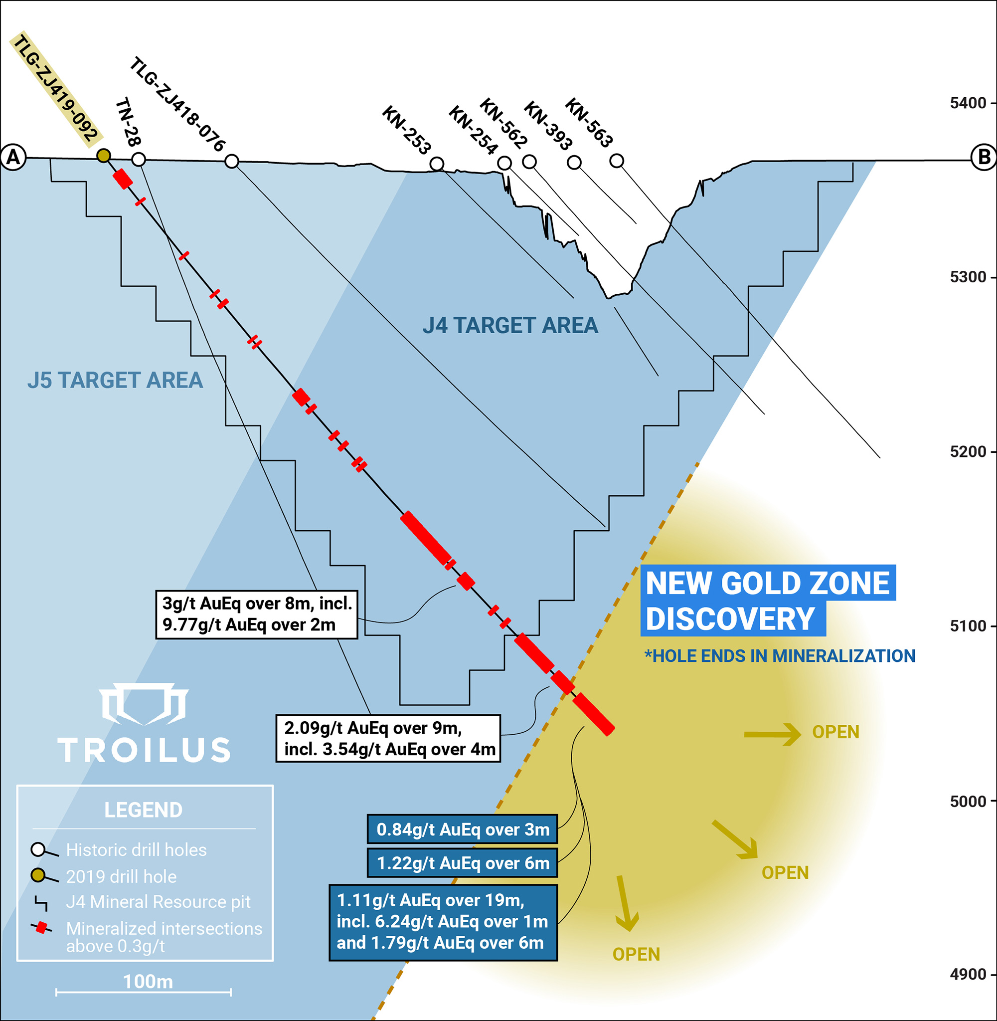 The discovery hole, TLG-J419-092, intersected gold-rich mineralization 300 metres from surface, in the immediate structural footwall to the J Zone (J4) mineralized zone. Drilling ended in gold-bearing mineralization (See Figure 1 and 2). Intercept highlights in the new gold zone, include: