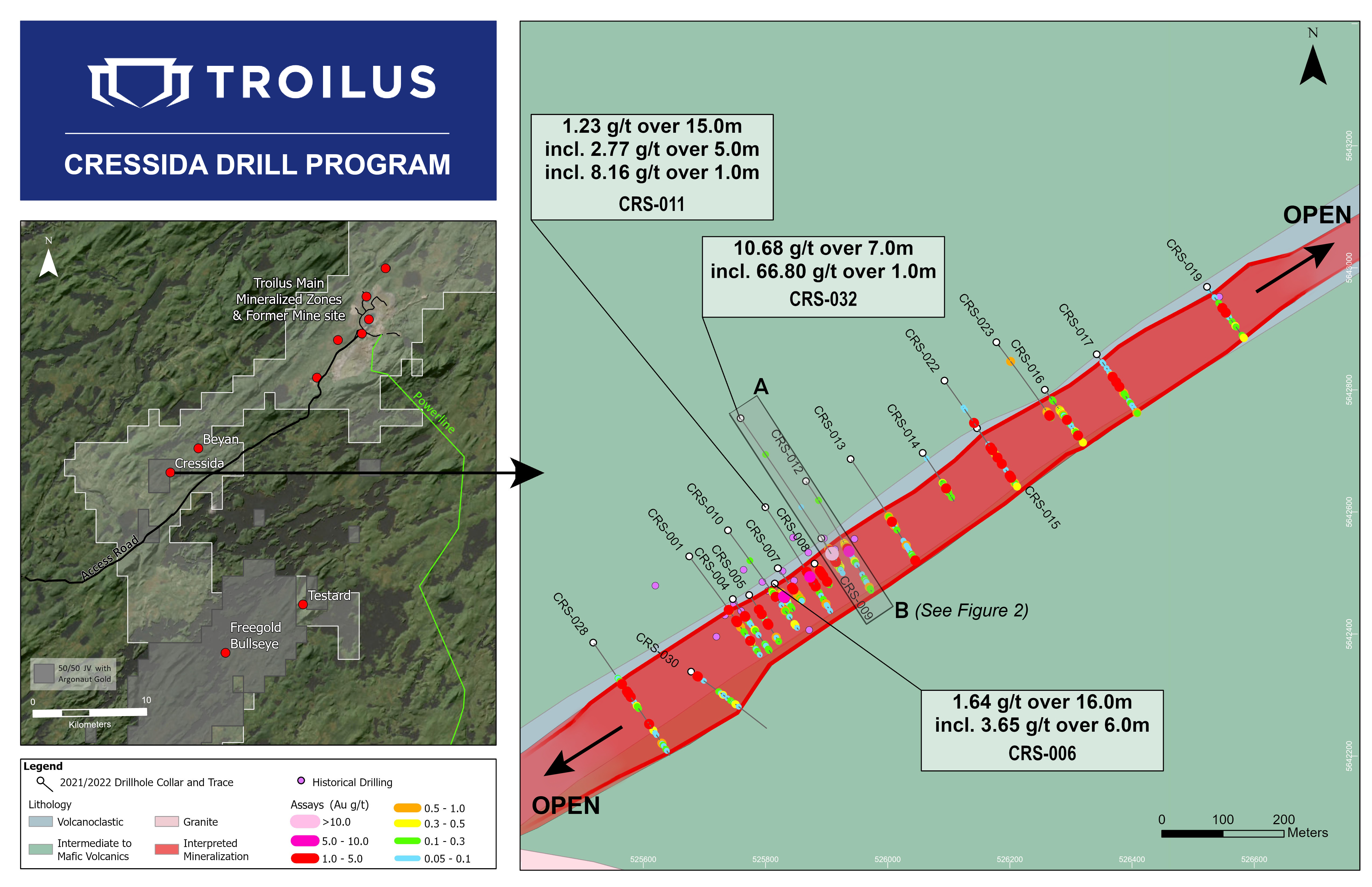La cible Cressida, qui fait l’objet d’une coentreprise en parts égales avec Argonaut Gold inc. a été héritée grâce à l’acquisition d’UrbanGold Minerals inc. (UGM) en 2021 (voir le communiqué de presse du 23 mars 2021). Dans le cadre de ses programmes d’exploration régionale des étés 2021 et 2022, Troilus a réalisé un programme de forage de 6 500 mètres à Cressida pour donner suite aux résultats de 1950 mètres de forage historiques dans le but de mieux définir et d’étendre la gîte connue de la minéralisation, qui s’étendait auparavant sur une longueur de 400 mètres. Les résultats de forage communiqués aujourd’hui ont permis de multiplier par plus de trois la continuité de la minéralisation, qui s’étend sur 1,3 kilomètre, et reste ouverte à une nouvelle expansion vers le nord-est et le sud-ouest, ainsi qu’en profondeur.