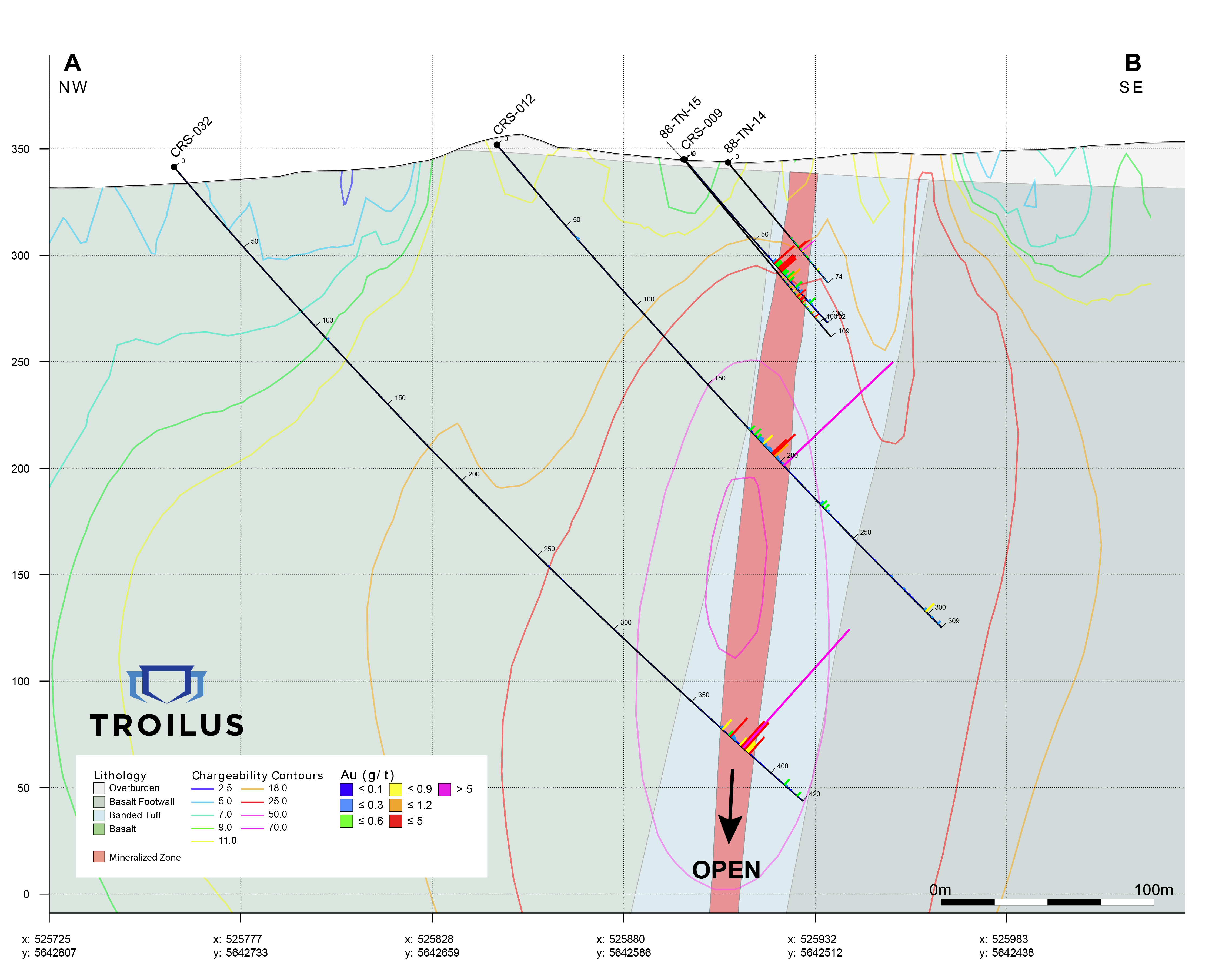 Cressida est située à environ 10 kilomètres au sud-ouest du corridor minéral principal et de l’ancienne mine Troilus. La minéralisation aurifère de cette cible se trouve dans un horizon volcanoclastique riche en sulfures, fortement cisaillé et altéré, au même niveau stratigraphique que le gisement principal de Troilus, qui produit une anomalie d’amplitude décelée par PI bien définie. Les forages historiques à Cressida ont déjà recoupé des minéralisations aurifères sur des largeurs importantes et près de la surface, y compris 1,6 g/t d’or sur 34 m (puits 88-TN-08) et 1 g/t d’or sur 44 m (puits 88-TN-07) (source : site Web du MERN, rapport GM 48341) et ont été validés par le premier programme de forage d’UGM qui a recoupé 1,02 g/t d’or sur 22 mètres (puits UTC-19-03).