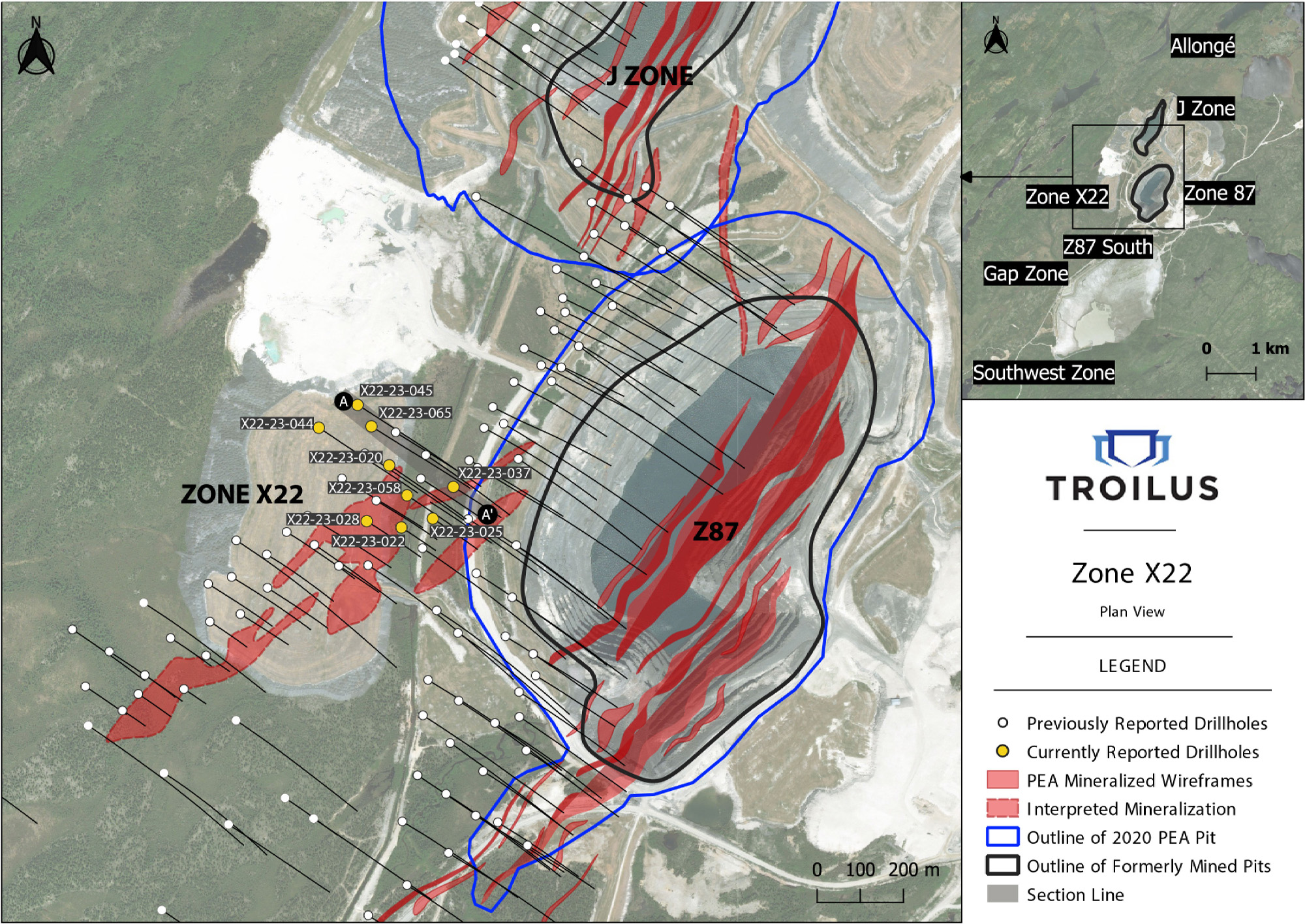 Les résultats des forages effectués dans la zone X22 ont systématiquement démontré la présence d’une minéralisation continue à haute teneur près de la surface et d’une importante accumulation sur une longueur de gisement d’environ un kilomètre, qui reste ouverte à l’expansion. Les derniers résultats ont permis de mieux définir la minéralisation dans la partie nord-est du couloir minéralisé de déformation de la zone X22 adjacente à la fosse Z87. Dans cette zone, les minerais à haute teneur sont caractérisés par des zones de cisaillement altérées par la potasse et des dykes de porphyre felsique, principalement le long du contact des daines d’un corps tonalitique au sein de l’intrusion de Troilus.