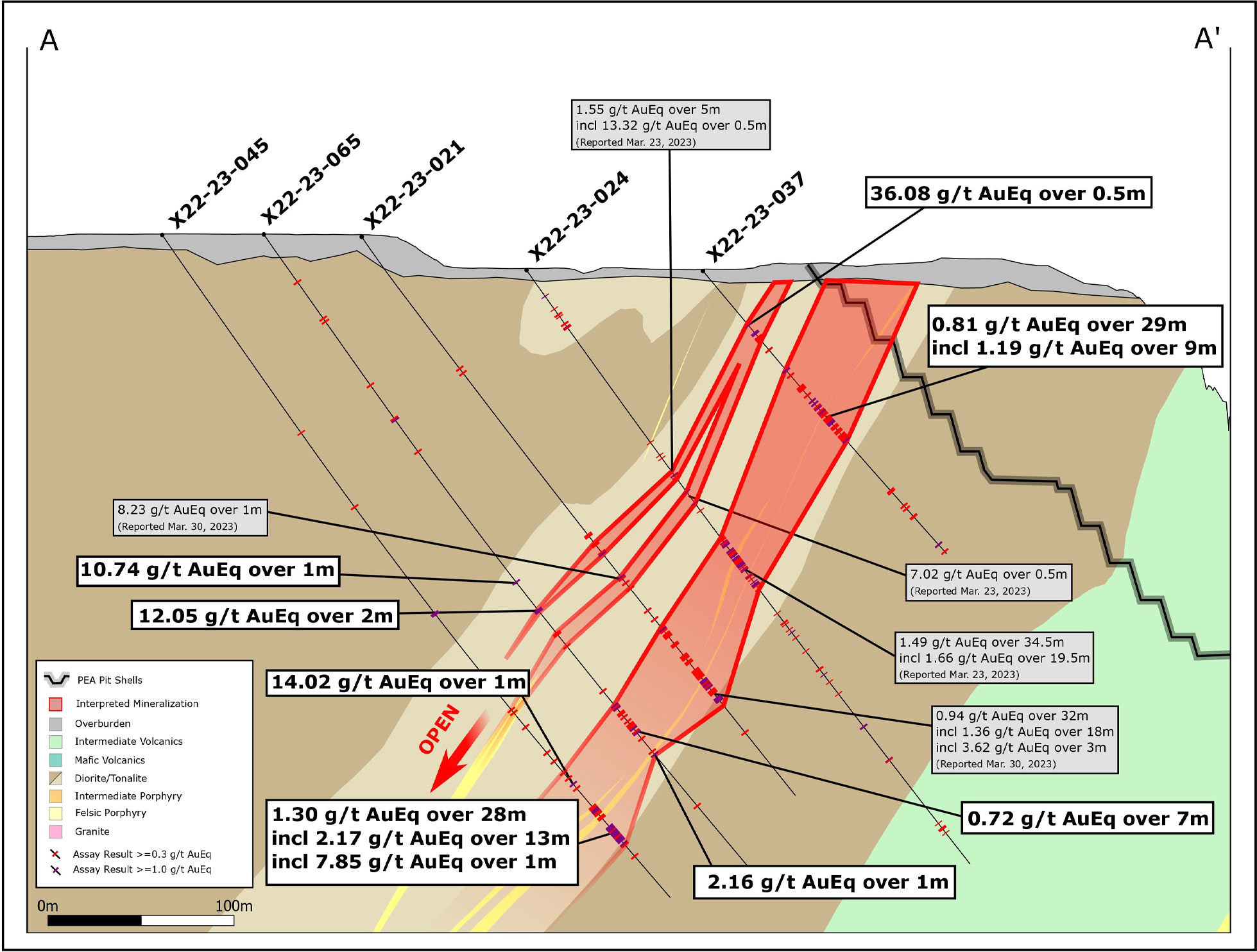 Les résultats annoncés aujourd’hui ont été obtenus dans la région la plus au nord-est de la zone X22, à proximité du bord de l’ancienne fosse à ciel ouvert Z87, confirmant la continuité minérale des structures à haute teneur entre les nouveaux puits de forage et ceux des rapports antérieurs (voir la vue aérienne dans la figure 1 et la section dans la figure 2). Tous les résultats présentés aujourd’hui se situent à l’extérieur des enveloppes de la fosse de l’EEP et seront inclus dans l’estimation des ressources minérales et l’étude de faisabilité à venir.