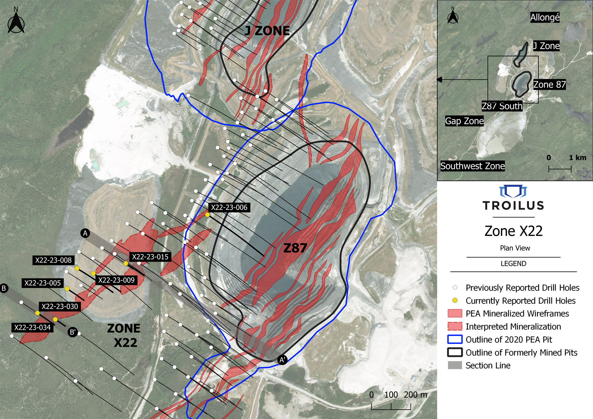 Le 25 avril 2023, Montréal, Québec – Troilus Gold Corp. (« Troilus » ou la « Société »; TSX : TLG; OTCQX : CHXMF; FSE : CM5R) annonce les résultats d’analyse de la zone X22 de son projet Troilus, situé dans le centre-nord du Québec, au Canada. Ces résultats s’inscrivent dans le cadre d’une campagne de forage de 7 800 mètres pour définir et étendre le gîte de minéralisation de la zone X22, une nouvelle zone à haute teneur aurifère s’étendant depuis la fosse Z87 anciennement exploitée découverte fin 2022 (voir la figure 1). Le programme a permis de définir la minéralisation continue sur une longueur de gisement de 1 km. Même si le programme de forage de délimitation initial dans la zone X22 est terminé, plus de 2 300 mètres d’analyses sont en attente. Ces analyses seront publiées dès qu’elles seront disponibles.