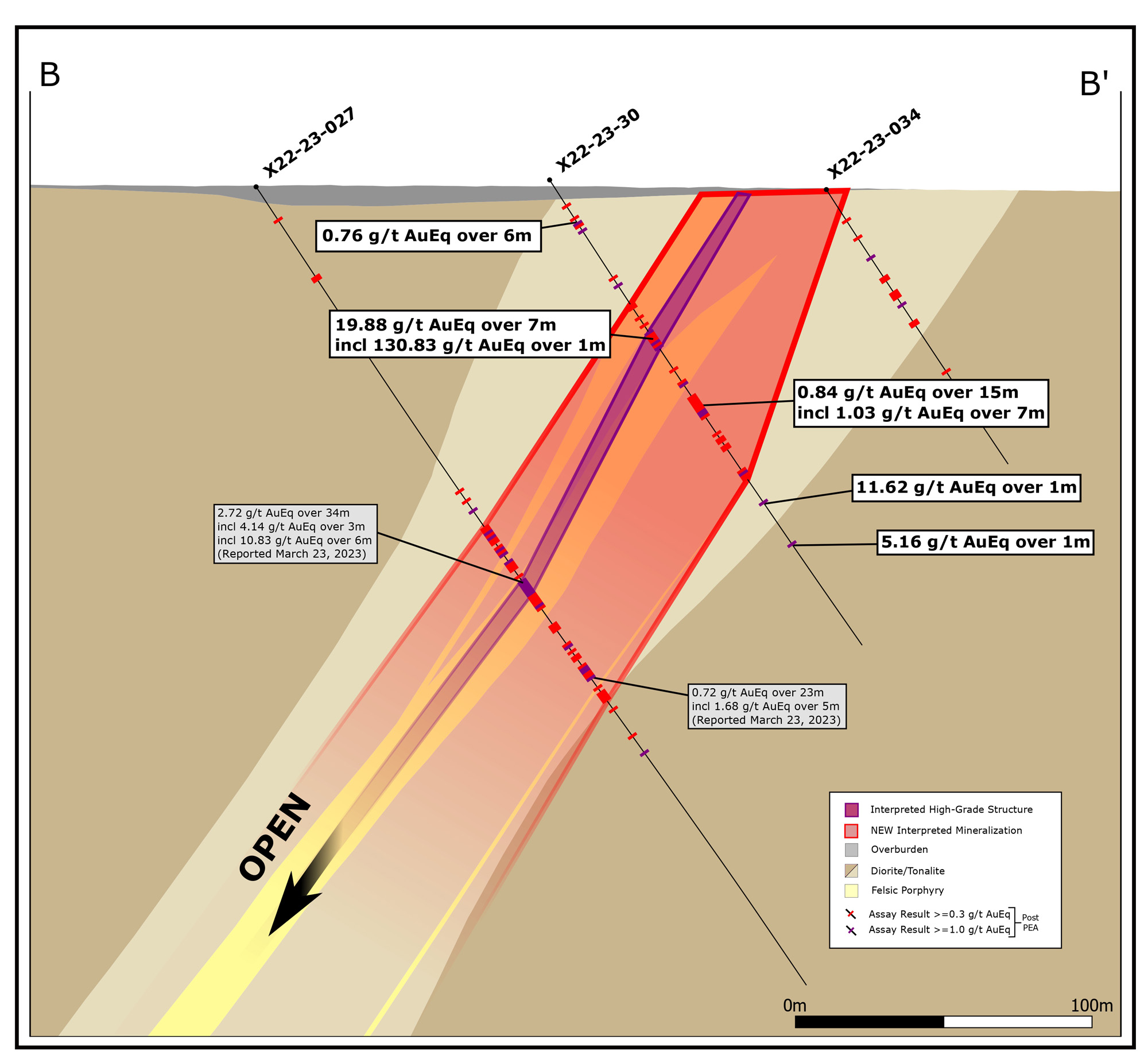 Le puits de forage X22-23-030 a intersecté 0,76 g/t d’équ.-or sur 6 m à la surface (de 15 m à 21 m en foration descendante), des teneurs élevées exceptionnelles de 130,83 g/t d’équ.-or sur 1 m dans une intersection élargie de 19,88 g/t d’équ.-or sur 7 m, ainsi que de 0,86 g/t d’équ.-or sur 15 m, y compris 1,03 g/t d’équ.-or sur 7 m, 11,62 g/t d’équ.-or sur 1 m et 5,16 g/t d’équ.-or sur 1 m à 50 m de la surface. Le puits X22-23-030 a permis de confirmer la présence d’une minéralisation à haute teneur de 100 m en amont-pendage au-delà du puits X22-23-027, qui présentait d’importantes interceptions de 2,72 g/t d’équ.-or sur 34 m, y compris 4,14 g/t d’équ.-or sur 3 m et 10,83 g/t d’équ.-or sur 6 m (voir le communiqué de presse du 23 mars 2023) et reste ouverte en profondeur (voir la figure 2).