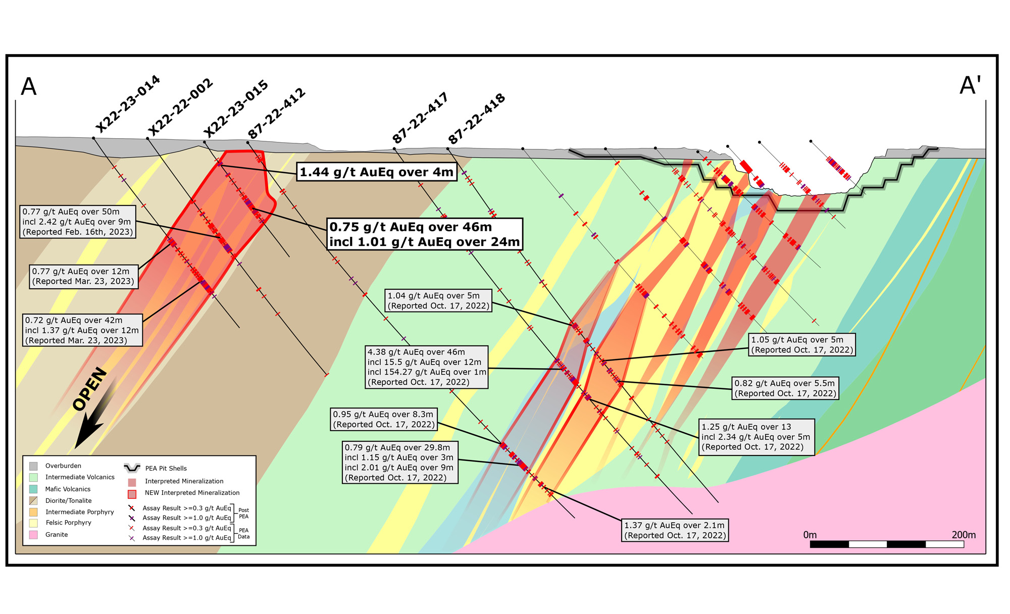 Le puits de forage X22-23-015 a intersecté 1,44 g/t d’équ.-or sur 4 m à la surface, ainsi que 1,01 g/t d’équ.-or sur 24 m dans une intersection élargie de 0,75 g/t d’équ.-or sur 46 m et a confirmé une minéralisation en amont-pendage de 50 m à partir du puits X22-22-002 foré précédemment reporté le 16 février 2023, ayant intersecté 0,77 g/t d’équ.-or sur 50 m, y compris 2,42 g/t d’équ.-or sur 9 m. Le puits X22-23-015 a aussi permis de confirmer la présence d’une continuité minérale sur 100 m comme le puits X22-23-014 précédemment reporté a intersecté 0,77 g/t d’équ.-or sur 12 m et 1,37 g/t d’équ.-or sur 12 m dans une intersection élargie de 0,72 g/t d’équ.-or sur 42 m, en aval-pendage de 50 m au-delà du puits X22-22-002 (voir le communiqué de presse du 23 mars 2023). Cette zone de minéralisation reste ouverte en profondeur (voir la figure 3).