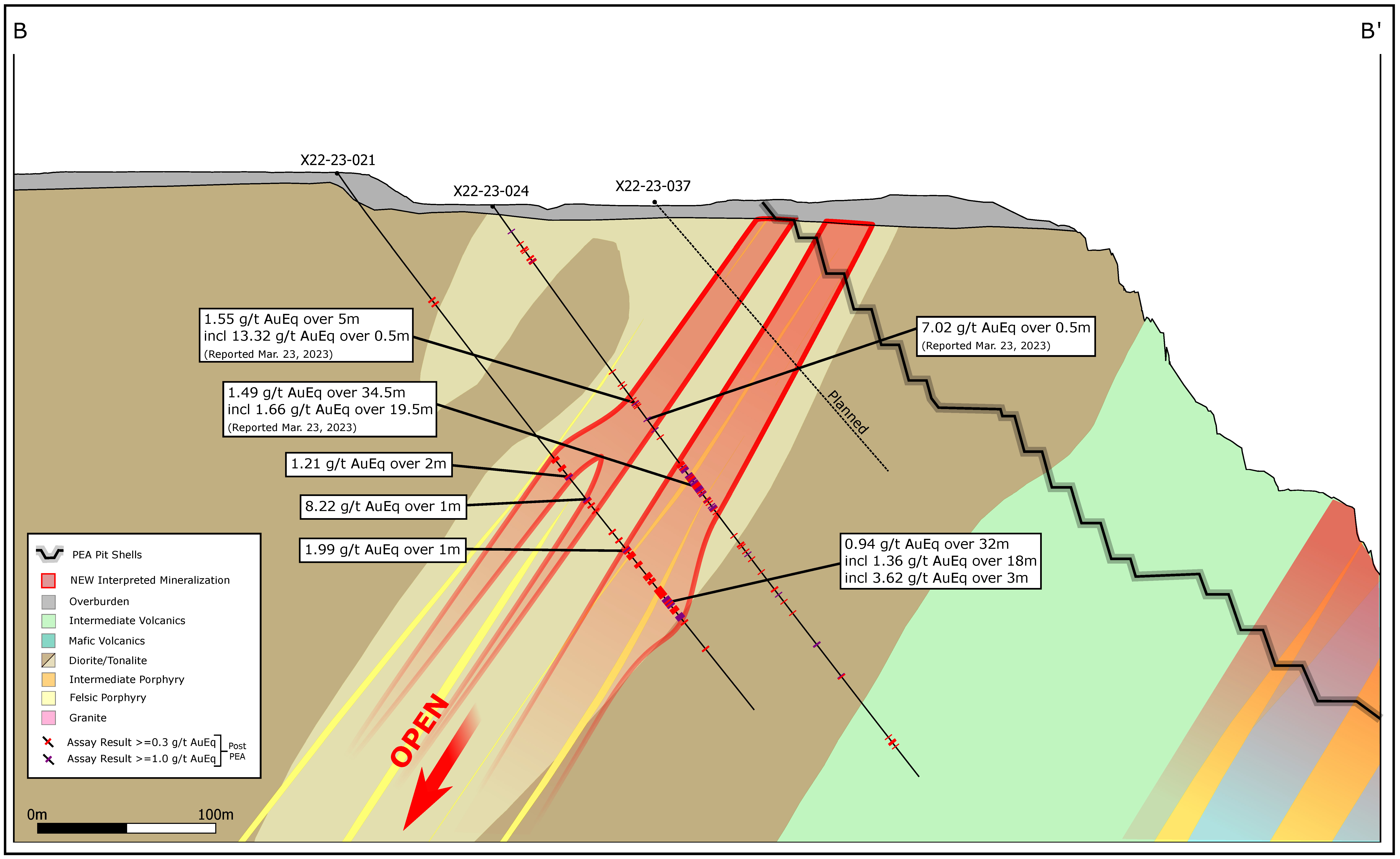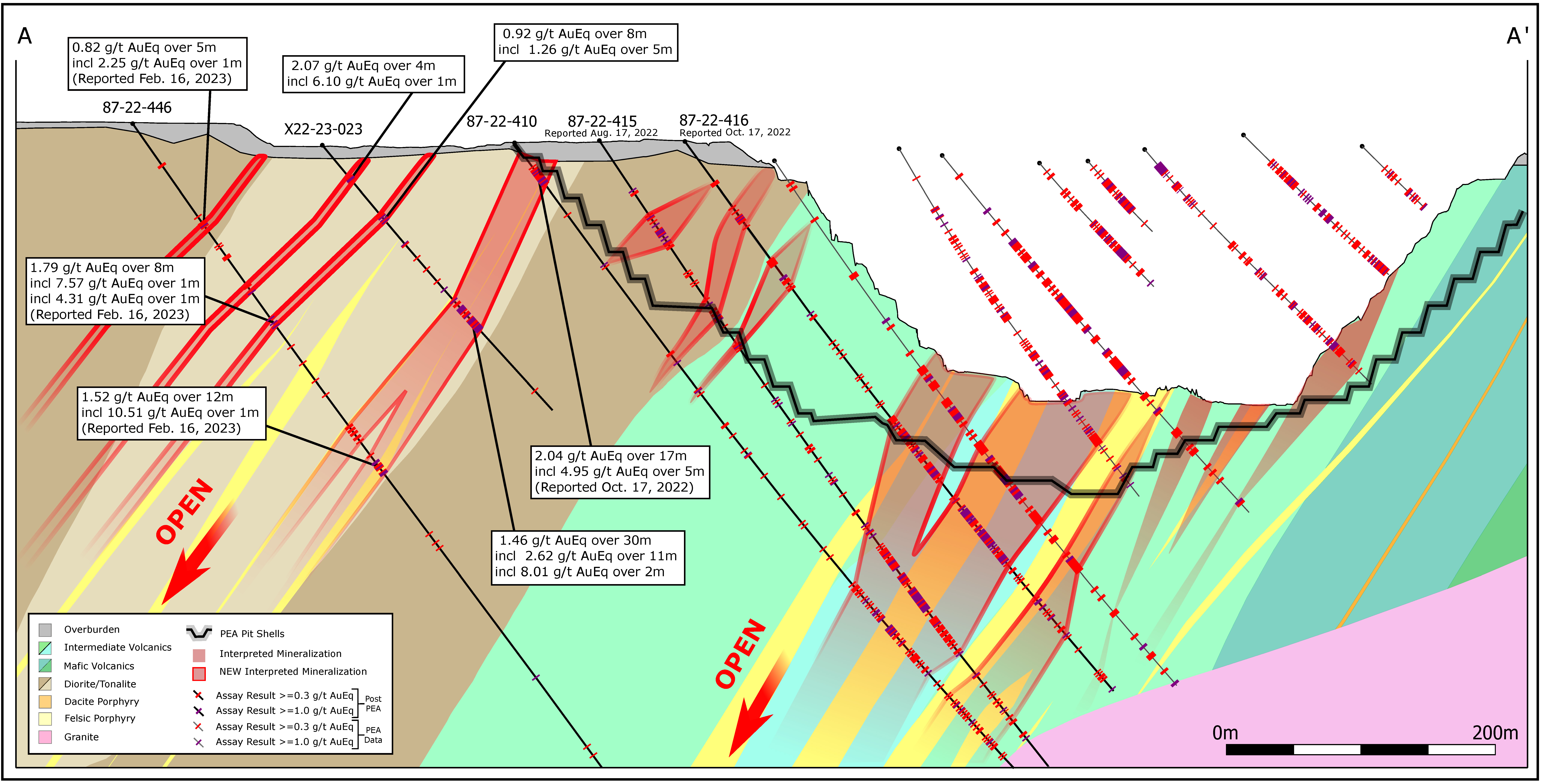 Le puits de forage X22-23-023 a intercepté 2,07 g/t d’équ.-or sur 4 m, y compris 6,10 g/t équ.-or sur 1 m à la surface ainsi que 2,62 g/t équ.-or sur 11 m dans une intersection de 1,46 g/t équ.-or sur 30 m à une profondeur d’environ 150 m de la surface, ce qui confirme une minéralisation de 100 m en amont-pendage au-delà du puits 87-22-446 qui présentait d’importantes interceptions de 1,52 g/t d’équ.-or sur 12 m, y compris 10,51 g/t d’équ.-or sur 1 m (voir le communiqué de presse du 16 février 2023). Le puits X22-23-023 confirme également la continuité minérale en comblant l’écart de 200 mètres avec le puits 87-22-410 précédemment reporté, qui a intercepté 2,04 g/t équ.-or sur 17 m, y compris 4,95 g/t équ.-or sur 5 m (voir la figure 3 et le communiqué de presse du 17 octobre 2022).
