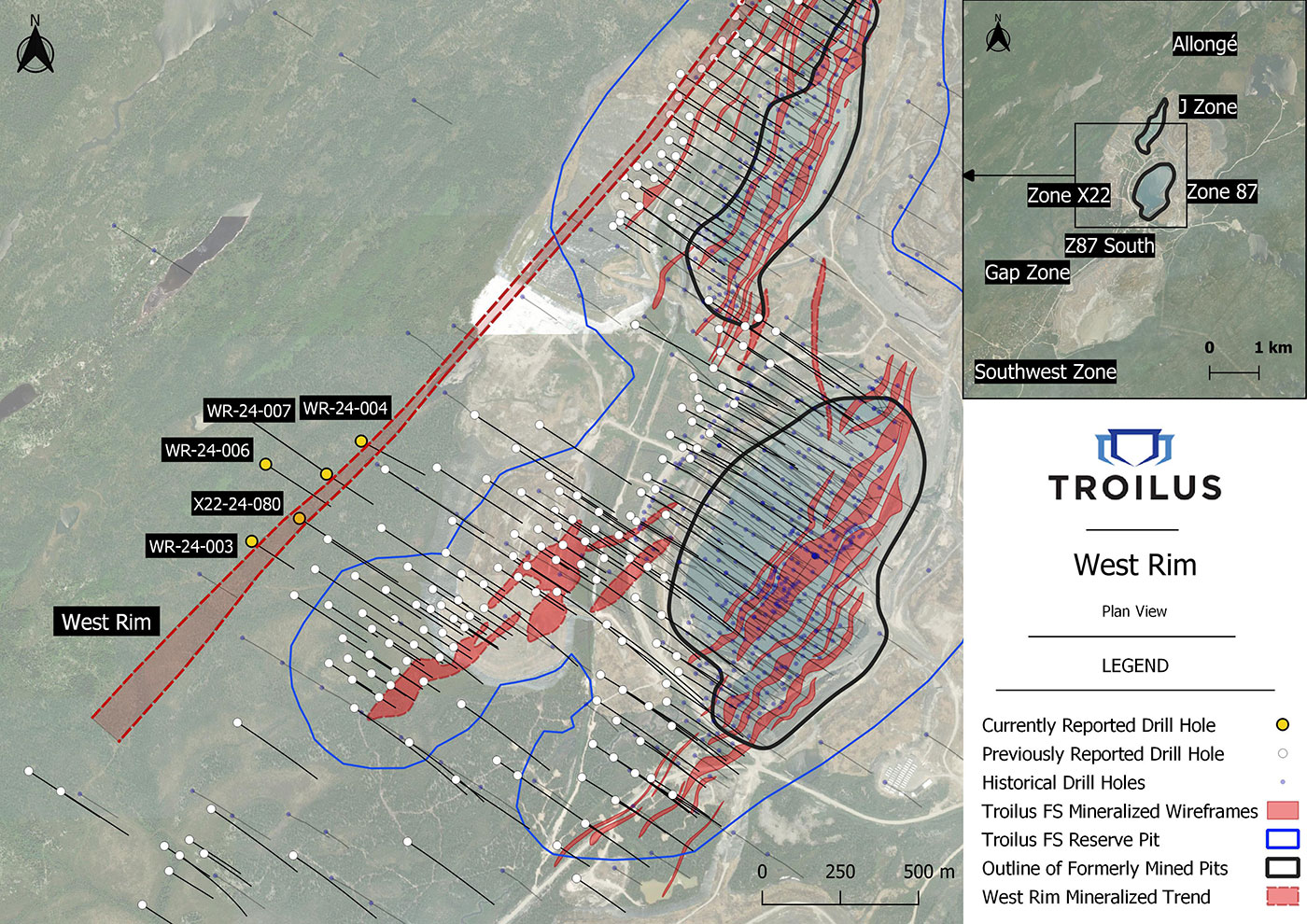 Le 3 septembre 2024, Montréal, Québec – Troilus Gold Corp. (« Troilus » ou la « Société »; TSX : TLG; OTCQX : CHXMF; FSE : CM5R) est fière d’annoncer des résultats positifs dans le cadre d’un programme de forage exploratoire de 1 866 mètres sur sa cible de gisement de sulfures massifs volcanogènes (SMV) nouvellement découverte dans la zone « West Rim », située à moins de 150 mètres de l’enveloppe de la fosse de la réserve nord (zones 87, J et X22) (voir la figure 1) dans le cadre de son projet Troilus, situé dans le centre nord du Québec, au Canada. Le programme de forage West Rim a été conçu pour tester diverses anomalies géophysiques et pour recueillir des données géologiques qui éclaireront la prochaine phase de forage.