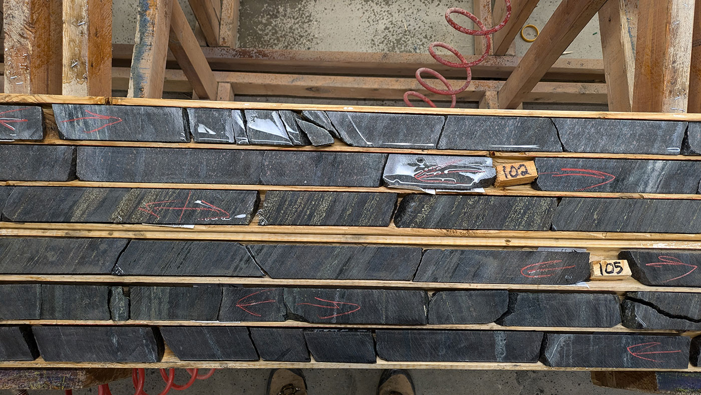 L’horizon West Rim est encaissé dans une séquence de basalt-andésite, d’andésite et de dacite, fréquemment dans la zone de transition entre les deux dernières. La zone minéralisée présente une zonation métallique claire, avec des zones riches en or (ainsi qu’en cuivre et en argent) flanquées de zones plus riches en zinc parallèlement à la direction et vers le haut dans la stratigraphie (au nord-ouest). La minéralisation sulfurée se compose de filonnets disséminés et de petites lentilles de pyrrhotite massive, de pyrite avec de la sphalérite et de la chalcopyrite accessoires transposées dans la foliation dominante et métamorphosées en roche amphibolique. La signature d’altération est caractérisée par une zone de séricite-grenat-silice dans l’éponte supérieure de la zone minéralisée et une zone de chlorite-biotite-séricite dans l’éponte inférieure (voir la figure 2). Ce motif a été observé et enregistré sur tout l’horizon et présente une signature lithogéochimique distinctive. En outre, la minéralisation et l’altération augmentent vers WR-24-003 et vers une structure de filon nourricier et un centre exhalatif interprétés. Les teneurs plus élevées semblent liées à un magnétisme plus fort en raison d’une augmentation de la teneur en pyrrhotite. Une anomalie magnétique située au centre de la zone exhalative est notre prochain forage prioritaire. La minéralisation zonée polymétallique, les roches hôtes volcaniques intermédiaires à felsiques et l’altération zonée suggèrent un système de sulfures massifs volcanogènes aurifères, ce qui augmente la prospectivité de la zone en vue de la découverte de zones de minerai plus vastes et plus riches parallèlement à la direction et en profondeur.
