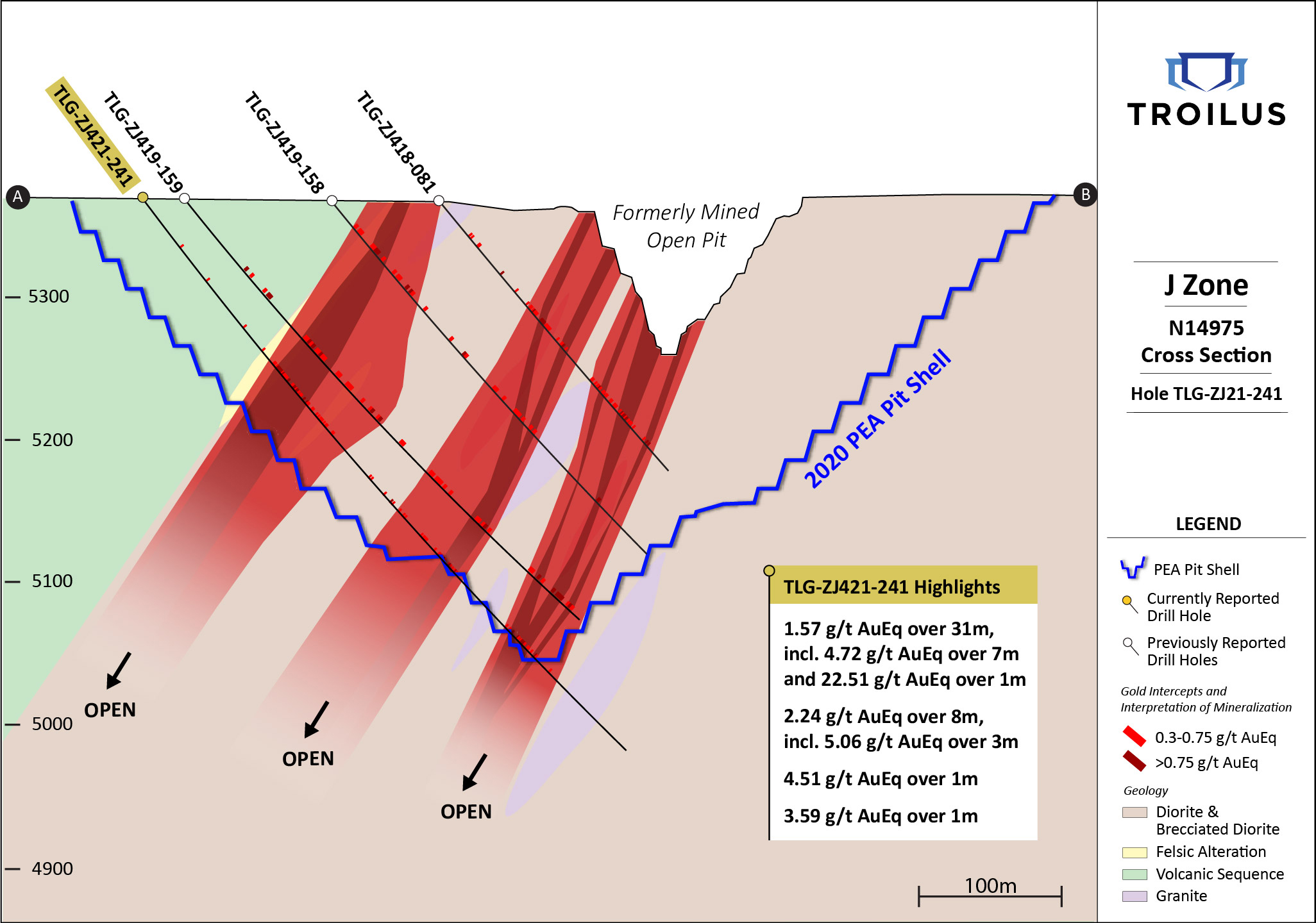 Le 7 juillet 2021, Toronto, Ontario — Troilus Gold Corp. (TSX : TLG; OTCQX : CHXMF) (« Troilus » ou la « Société ») fait état de résultats de forage du secteur J dans le cadre de son programme d’exploration et de forage intercalaire continu du projet aurifère détenu à 100 % par Troilus (« Troilus » ou le « Projet »), le plus important projet de développement d’or et de cuivre au Québec, au Canada. De nouveaux résultats ont encore élargi le prolongement ouest de la zone J de 150 mètres au nord-est. L’axe de cette nouvelle zone minéralisée est passé de 200 mètres à 850 mètres depuis sa première identification en mai 2021 (voir les communiqués de presse en date du 12 mai et du 8 juin 2021). De plus, plusieurs sondages d’extension ont étendu la minéralisation en aval-pendage à environ 60 mètres au-delà de ce qui était précédemment connu, et jusqu’à environ 90 mètres sous l’enveloppe de la fosse proposée dans l’évaluation économique préliminaire (« EEP ») en maintenant des teneurs et des épaisseurs cohérentes et supérieures à la moyenne.