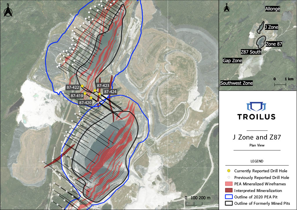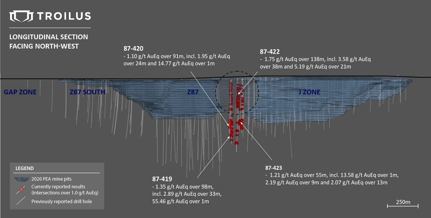 Le 8 novembre 2022, Montréal, Québec – Troilus Gold Corp. (« Troilus » ou la « Société » TSX : TLG; OTCQX : CHXMF) annonce des résultats positifs du secteur Z87 de son projet Troilus, situé dans le centre nord du Québec, au Canada. Les résultats découlent d’un programme de forages réalisés récemment à 11 000 m, qui avait pour but d’élargir la minéralisation vers le nord et le sud de la fosse Z87, la plus vaste des deux anciennes fosses d’exploitation minière, qui présente encore les ressources les plus contiguës et les teneurs les plus élevées de Troilus.
