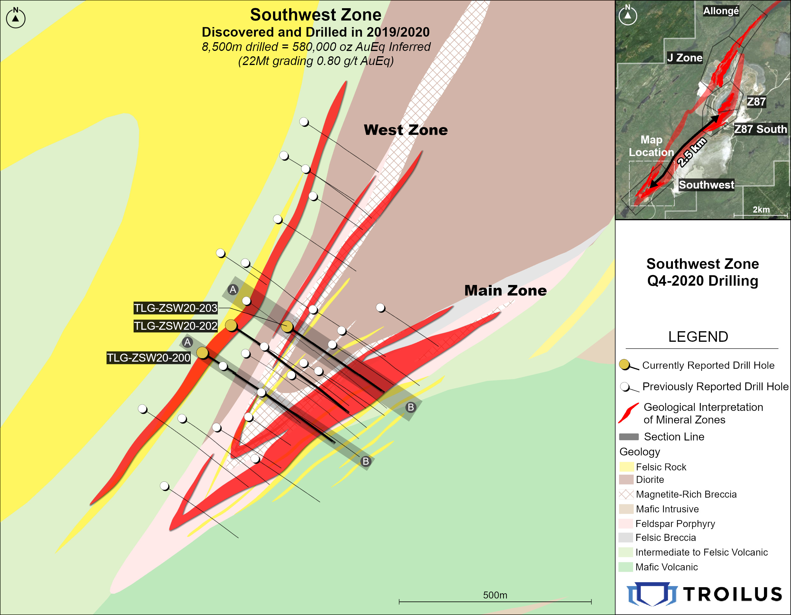 Le secteur sud-ouest se situe à environ 2,5 km au sud-ouest de l’ancienne mine et de la principale zone de ressources minérales (voir figure 1). Il a été découvert et foré à l’origine à la fin de 2019 et au début de 2020 à la suite de certains travaux de modélisation géologique réalisés récemment par l’équipe technique de Troilus. Des forages sommaires de 8 500 mètres dans ce secteur ont déjà défini une estimation de ressources présumées de 580 000 onces d’équivalent or (22,6 Mt, à une teneur moyenne de 0,80 g/t d’équ.-or).