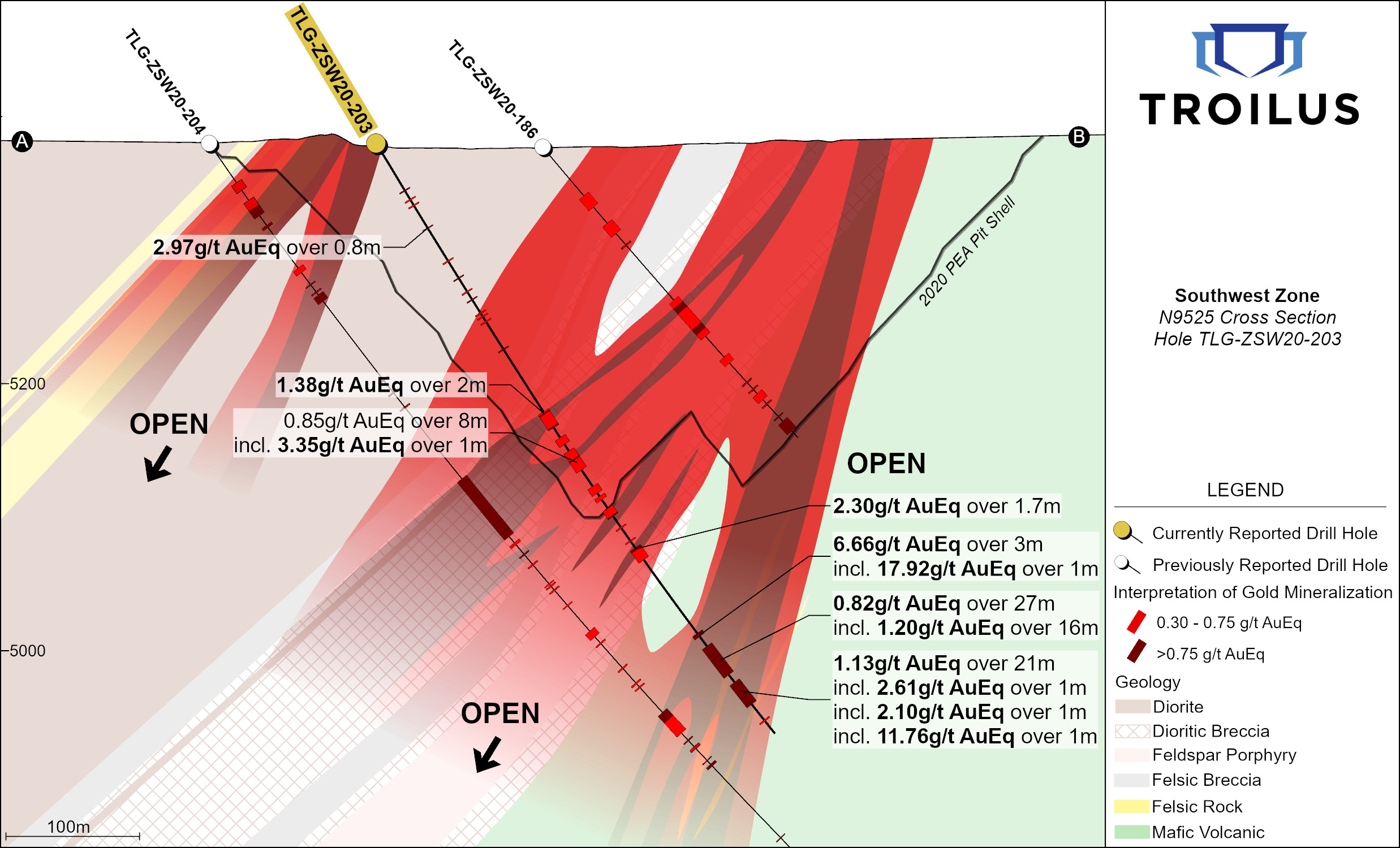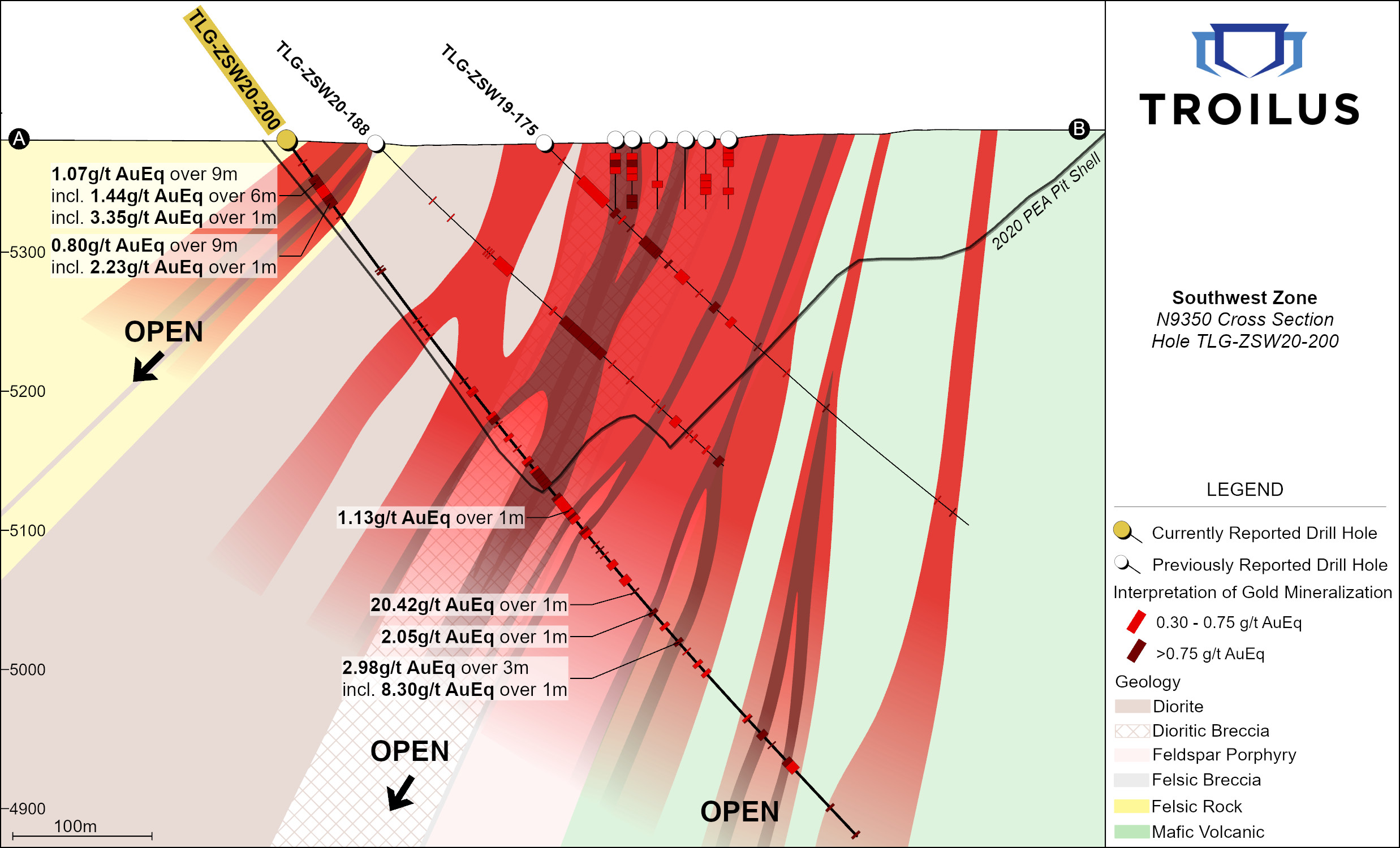 9 février 2021, Toronto, Ontario — Troilus Gold Corp. (TSX : TLG; OTCQB : CHXMF) (« Troilus » ou la « Société ») fait état de nouveaux résultats d’analyse des forages de l’hiver et de l’automne 2020 réalisés dans le cadre du projet aurifère détenu à 100 % par Troilus (« Troilus » ou le « Projet ») situé au centre nord du Québec (Canada). Les résultats des trous de forage suivants ont été obtenus pour le secteur sud-ouest, une cible d’exploration prioritaire qui a été découverte et forée à la fin de 2019 et au début de 2020 (voir figure 1). Ces résultats ont décelé des élargissements de minéralisation en profondeur qui n’avaient pas encore été circonscrits et confirmé la continuité de la minéralisation dans des zones non forées de la fosse proposée dans l’évaluation économique préliminaire (« EEP ») (consulter le communiqué de presse du 31 août 2020).