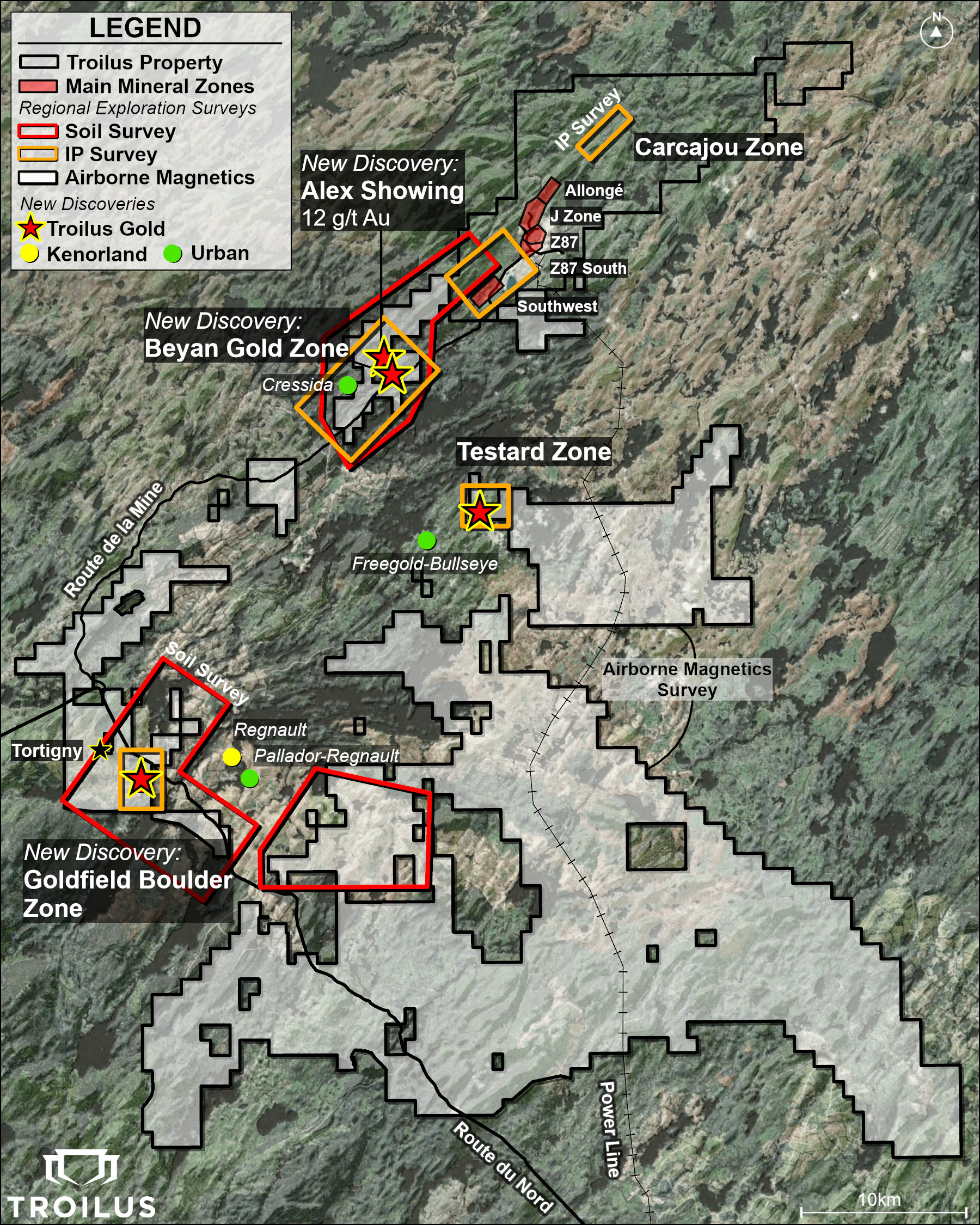 Figure 1 — Vue aérienne du terrain minier de Troilus indiquant les découvertes récentes et les zones couvertes par les levés