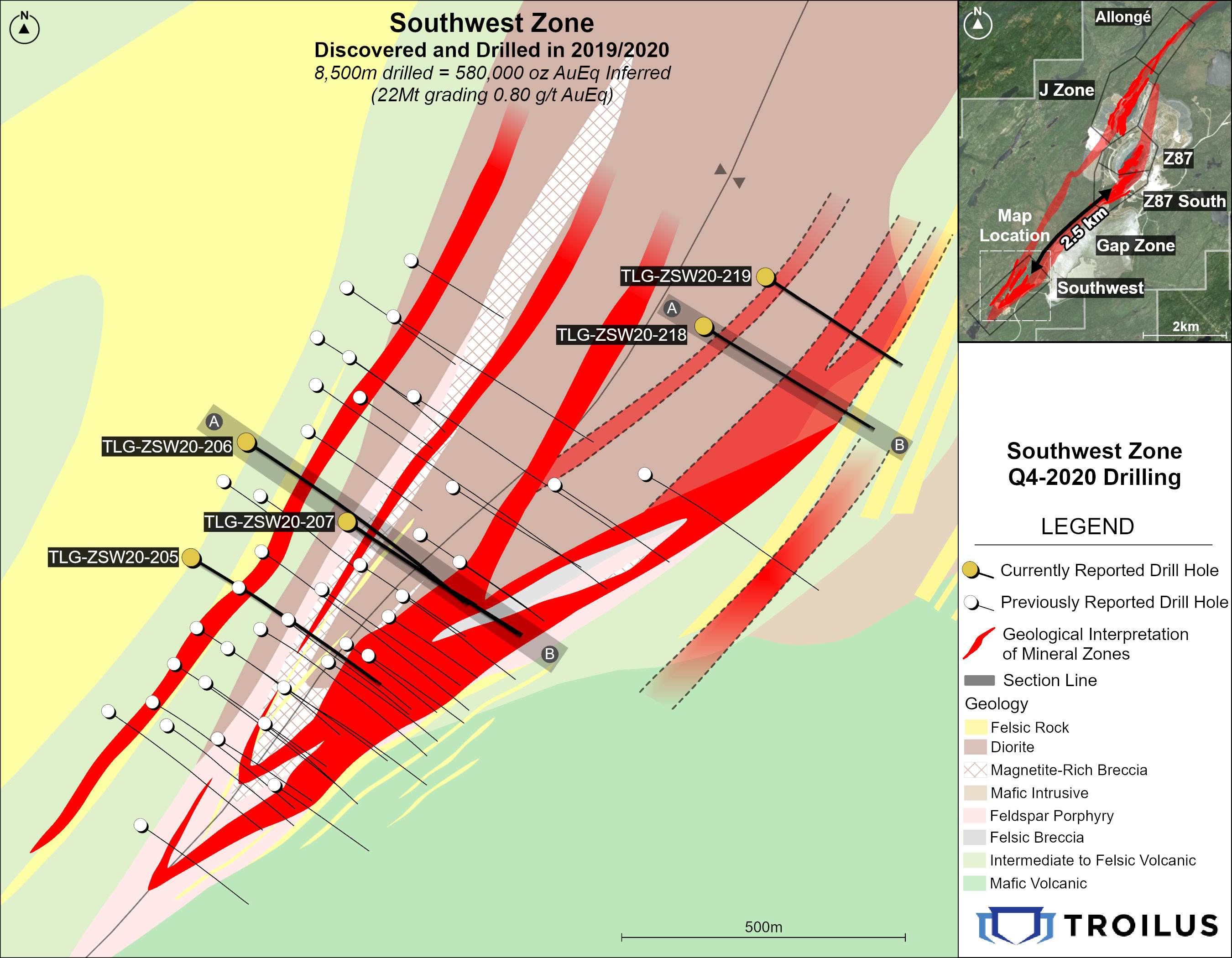 « Le secteur sud-ouest s’agrandit encore et dépasse nos attentes. À chaque puits d’extension, le système se prolonge au nord-est vers les limites actuelles du sud du secteur Z87 – une zone que nous identifions maintenant comme la “ zone lacunaire ”, a indiqué Justin Reid, chef de la direction de Troilus Gold. Ce forage récent a intercepté des élargissements ciblés en aval du pendage du forage historique peu profond réalisé par Inmet Mining Corporation en 1986. Cette zone a été délaissée en raison de la découverte subséquente du secteur Z87, qui est devenu la fosse principale d’extraction d'Inmet. Deux forages sont en cours dans la zone lacunaire et nous avons l’intention d’en déployer un troisième. La continuité de la minéralisation est une excellente nouvelle et la zone lacunaire continuera d’occuper une grande partie de nos travaux au printemps et à l’été de 2021 afin de nous aider à appréhender la composition et la portée des résultats que nous observons. »