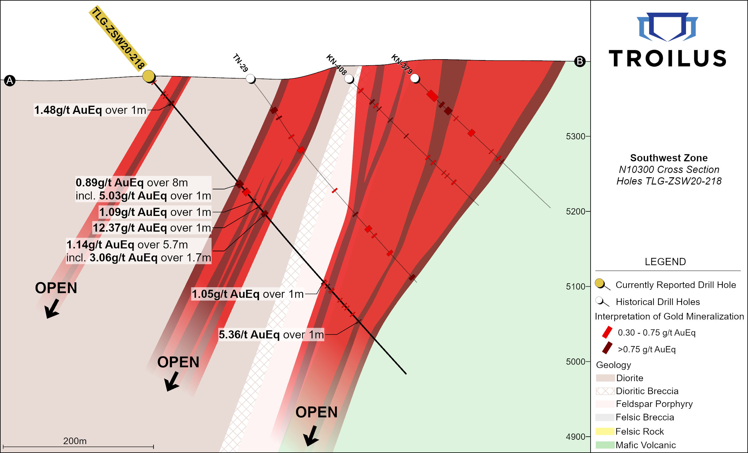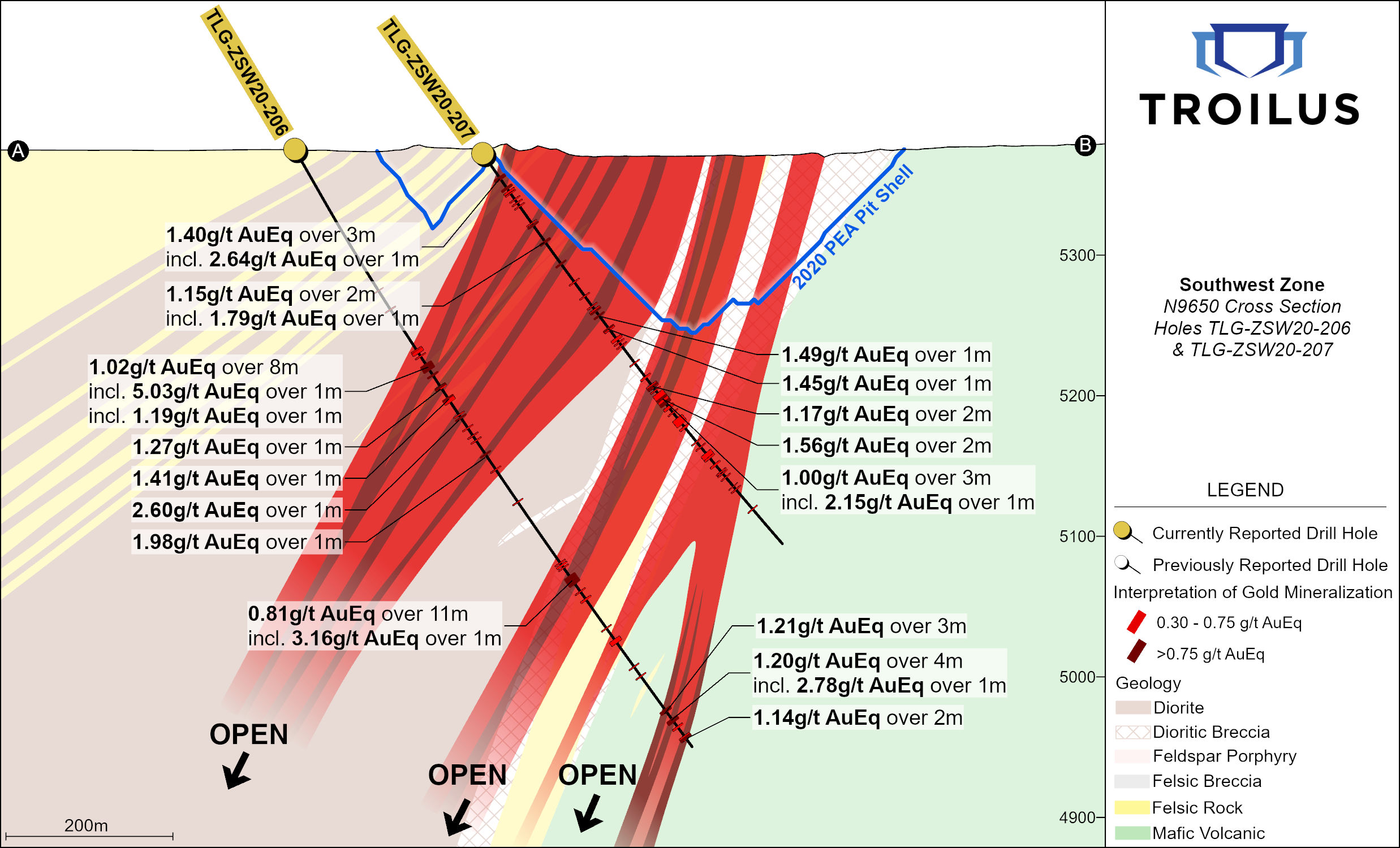 À l'origine, ce secteur sud-ouest a été découvert et foré à la fin de 2019 et au début de 2020 à la suite de certains nouveaux travaux de modélisation géologique réalisés par l’équipe technique de Troilus. Un forage de seulement 8 500 mètres effectué dans ce secteur a contribué à une estimation des ressources présumées de 580 000 oz d’équ.-or (22,6 Mt, à une teneur moyenne de 0,80 g/t d’équ.-or) à l’estimation totale de ressources minérales indiquées de 4,96 Moz d’équ.-or (177 Mt à une teneur moyenne de 0,87 g/t d’équ.-or) et 3,15 Moz d’équ.-or présumées (116,7 Mt à une teneur moyenne de 0,84 g/t d’équ.-or) (consulter le communiqué de presse annonçant la plus récente estimation de ressources minérales du 28 juillet 2020). Dans les mois qui viennent, Troilus entend mener des forages intercalaires dans le secteur sud-ouest, qui seront nécessaires afin d’incorporer tous les nouveaux secteurs de minéralisation découverts dans la mise à jour de l’estimation des ressources minérales et de l’étude de préfaisabilité, qui devrait être terminée au deuxième semestre de 2021.