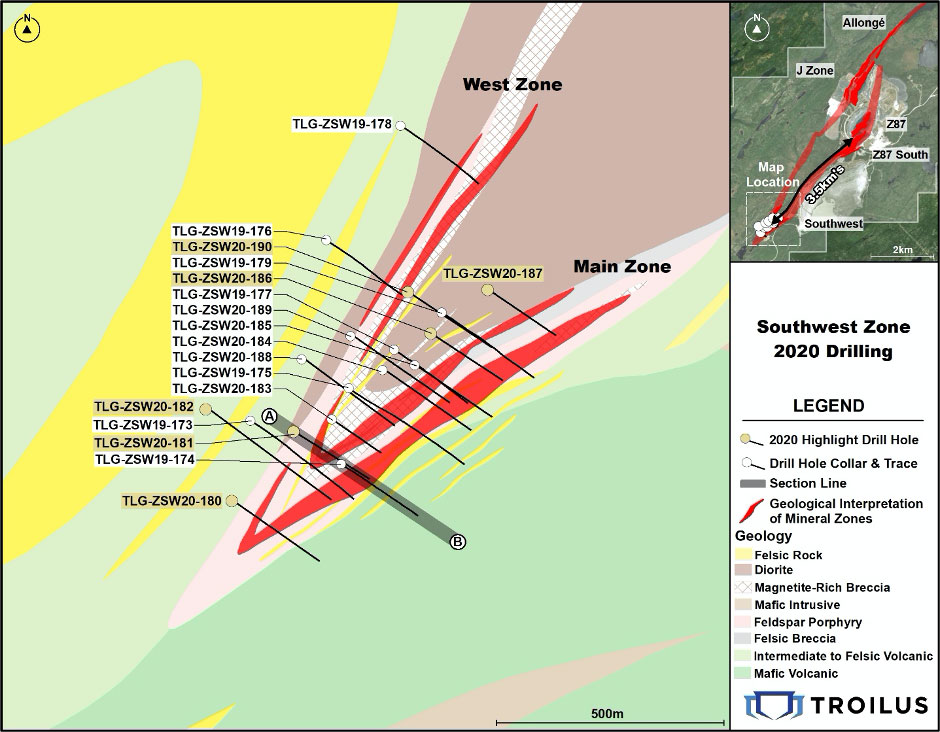 May 14, 2020, Toronto, Ontario – Troilus Gold Corp. (TSX: TLG; OTCQB: CHXMF) (“Troilus” or the “Company”) reports additional results from the 6,000 metre drill program completed earlier this year in the Southwest Zone (the “Southwest Zone” or “SWZ”) at its 100%-owned Troilus property (the “Troilus Project”) located northeast of Chibougamau, Quebec in the prospective Frôtet-Evans Greenstone belt. All drill holes reported herein successfully intersected the targeted system and demonstrated geology similar to the main mineralized zone on the property, Z87, located less than 3.5 kilometres to the northeast of the SWZ.