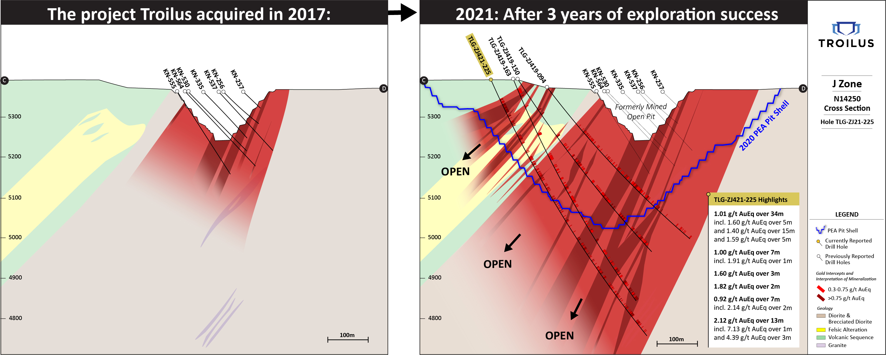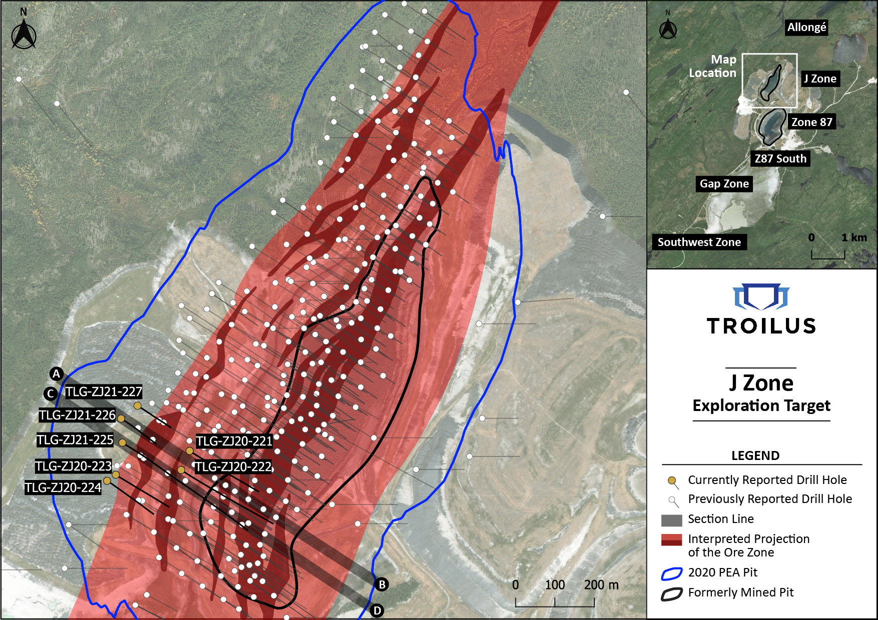 Le 12 mai 2021, Toronto, Ontario — Troilus Gold Corp. (TSX : TLG; OTCQB : CHXMF) (« Troilus » ou la « Société ») fait état de résultats de forage positifs du secteur J dans le cadre du programme d’exploration et de forage intercalaire continu du projet aurifère détenu à 100 % par Troilus (« Troilus » ou le « Projet »), le plus important projet de développement d’or et de cuivre au sein de la ceinture de roches vertes Frôtet-Evans au Québec, au Canada. L’identification d’une nouvelle extension occidentale substantielle du secteur J, tracée sur un minimum de 200 mètres dans la fosse, préalablement modélisée comme des stériles JL1 dans l'enveloppe de la fosse proposée dans l’Évaluation économique préliminaire (« EEP ») (consulter le communiqué de presse du 31 août 2020), a le potentiel d’ajouter une valeur substantielle au modèle de développement de la Société.