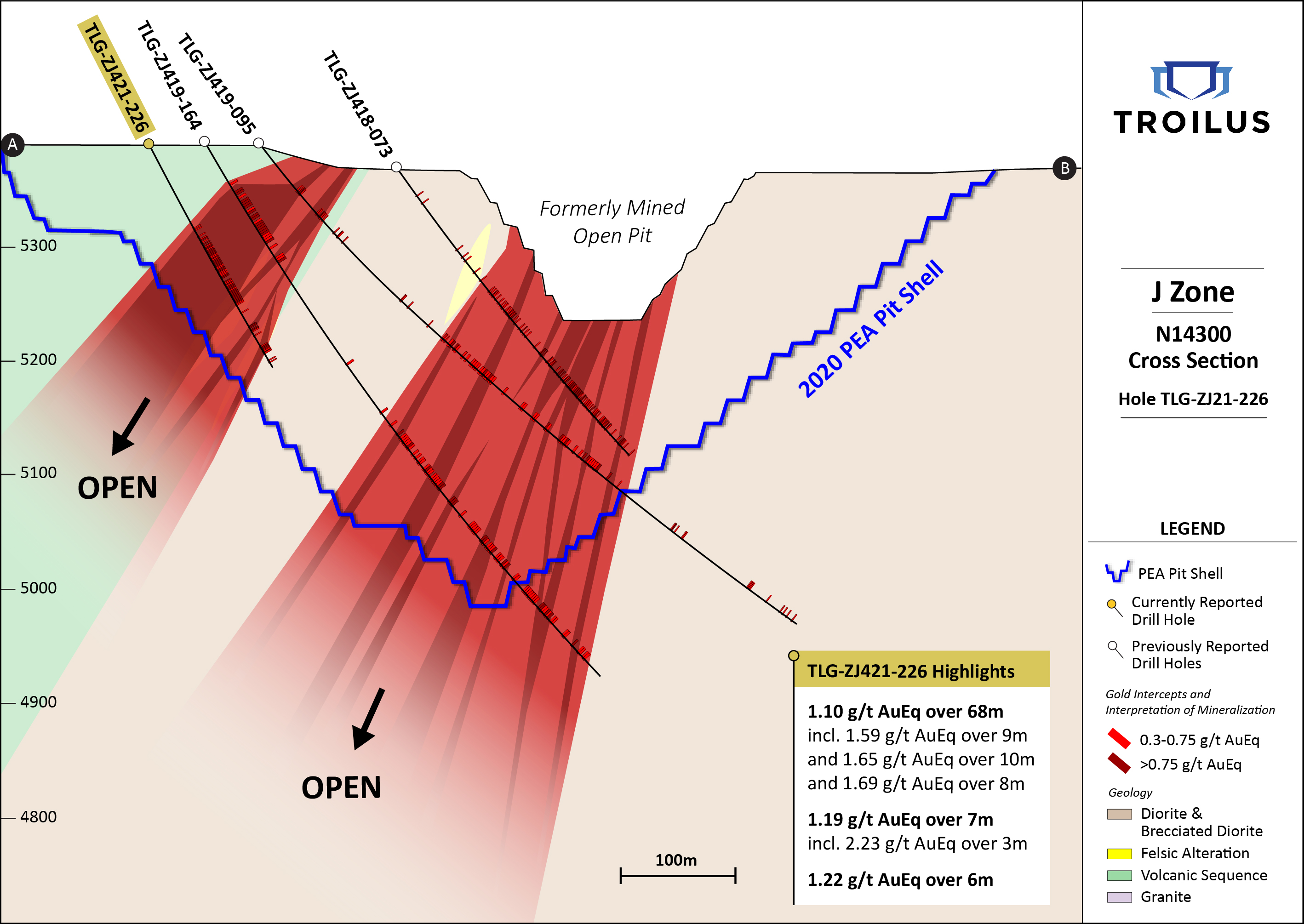 Ces résultats ont défini de nouvelles extensions de minéralisation à l’intérieur et à l’extérieur de l'enveloppe de la fosse proposée dans l’EEP, dont un nouveau secteur aurifère avec minéralisation continue sur 68 mètres à 200 m de la surface (voir le puits de forage TLG-ZJ21-226, figure 3). La minéralisation aurifère dans le secteur J cible couvre actuellement une zone d’environ 1,5 km par 1 km et demeure ouverte dans toutes les directions (voir figure 1).