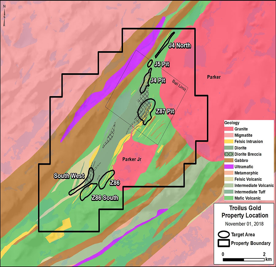 3. Southwest Zone: Based on historic drilling success, initiate near surface exploration 3.5 kilometre Southwest of Z87 open pit along the Troilus Diorite boundary (Figure 2)