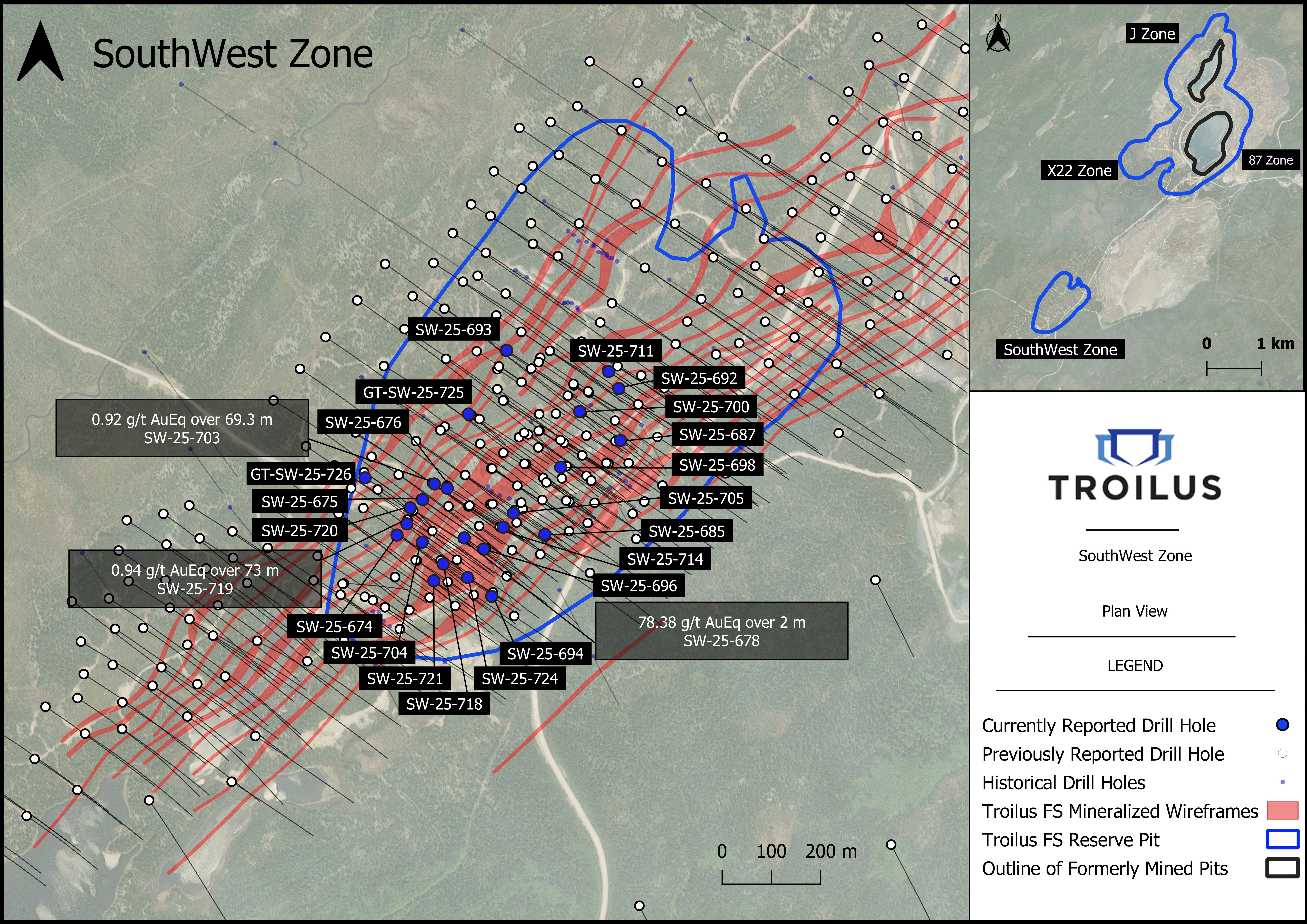 Montréal (Québec), le 17 juin 2025 – Troilus Gold Corp. (« Troilus » ou la « Société ») (TSX: TLG; OTCQX: CHXMF; FSE: CM5R) a le plaisir d’annoncer les résultats d’analyse finaux provenant de la zone Southwest («Southwest») dans le cadre de sa campagne de forage 2025 (annoncée dans le communiqué de presse du 4 février 2025) sur son projet Troilus, situé dans le centre-nord du Québec, au Canada. Le programme de forage, maintenant terminé, dans la zone Southwest visait à identifier et délimiter une minéralisation à plus haute teneur et à renforcer la confiance dans le modèle de blocs pour cette zone, tel que présenté dans l’étude de faisabilité de mai 2024 (voir le communiqué de presse du 14 mai 2024).