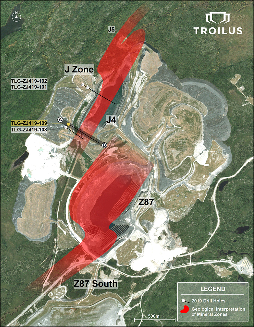 Troilus intends to drill over 40,000 metres as part of its 2019 exploration program, targeting zones Z87 South, the J Zone and J4 North (see press release dated February 7, 2019 for an overview of mineral zones and drill targets).