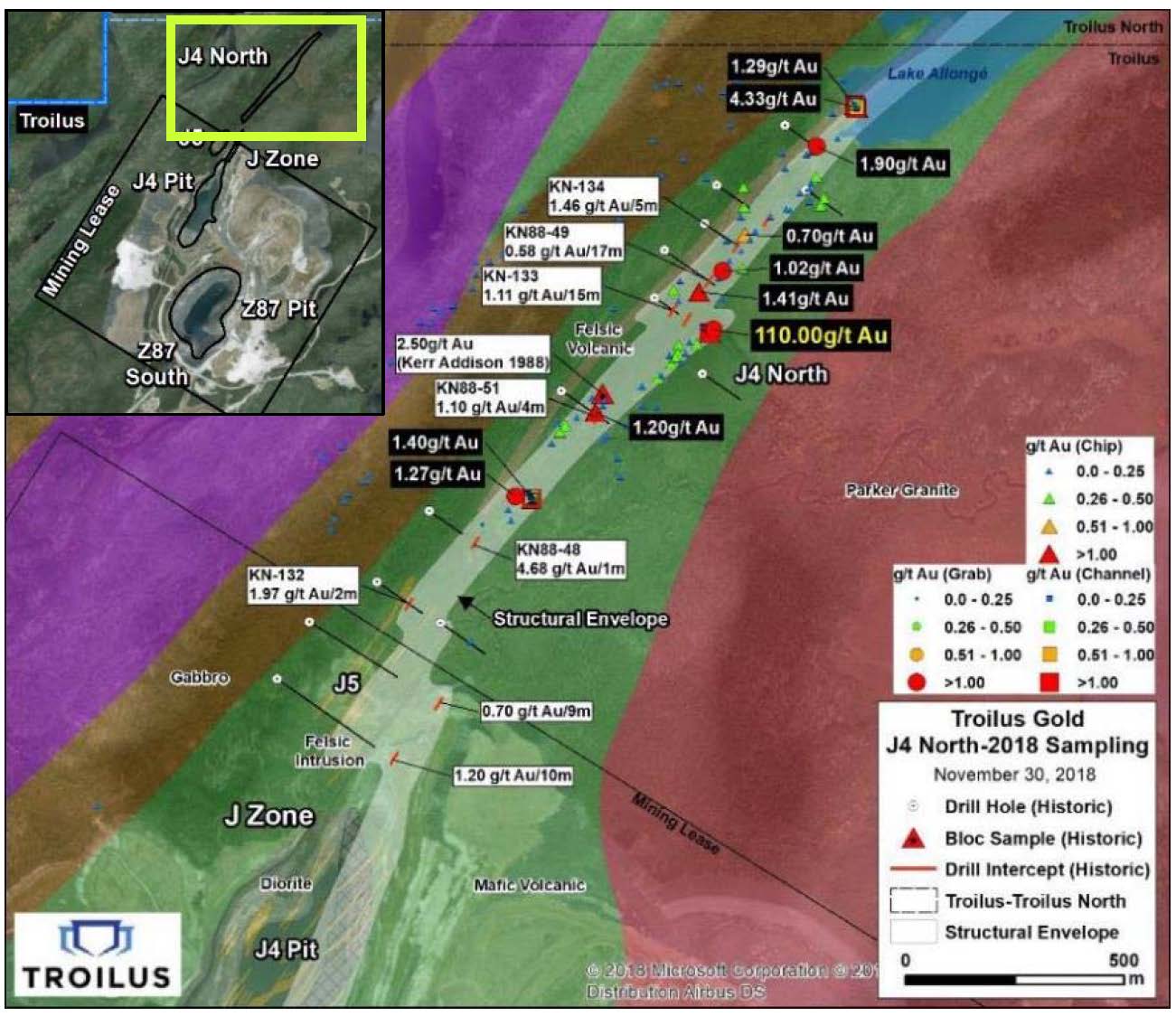 J4 North represents an area of mineralization running 1.8 kilometres from the end of the J Zone to the former boundary of the Troilus gold property (see Figure 4). The excellent results obtained from surface exploration in 2018, including outcrop samples returning over 100 g/t Au and 4 g/t Au, led to the acquisition of over 11,000 hectares to the immediate northeast. This trend could represent the extension of the J Zone or potential new gold deposits to the northeast.