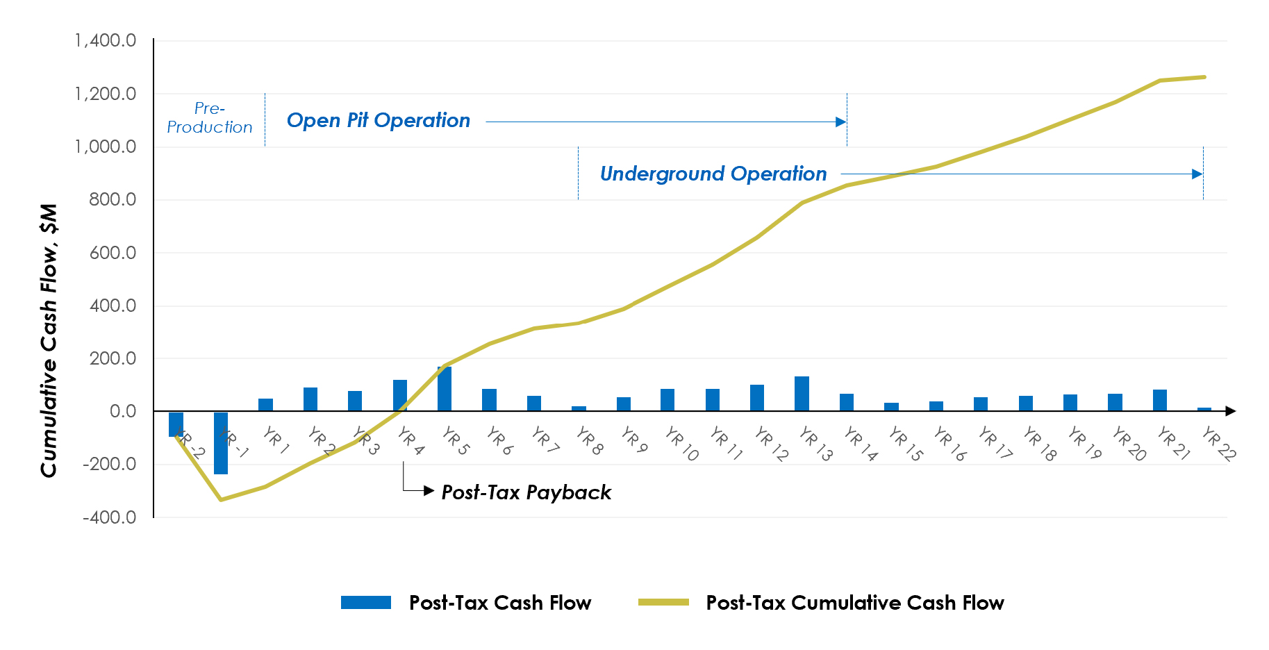 Le projet génère un flux de trésorerie cumulatif de 1,27 G$ US après taxes et de 2,04 G$ US avant taxes, selon un scénario de référence de 1 475 $ US l’once d’or en fonction d’une cadence de production de 35 000 tpj pendant 22 ans. L’EEP suppose une exploitation à ciel ouvert pendant les quatorze premières années, une exploitation souterraine étant lancée à partir de la huitième année.