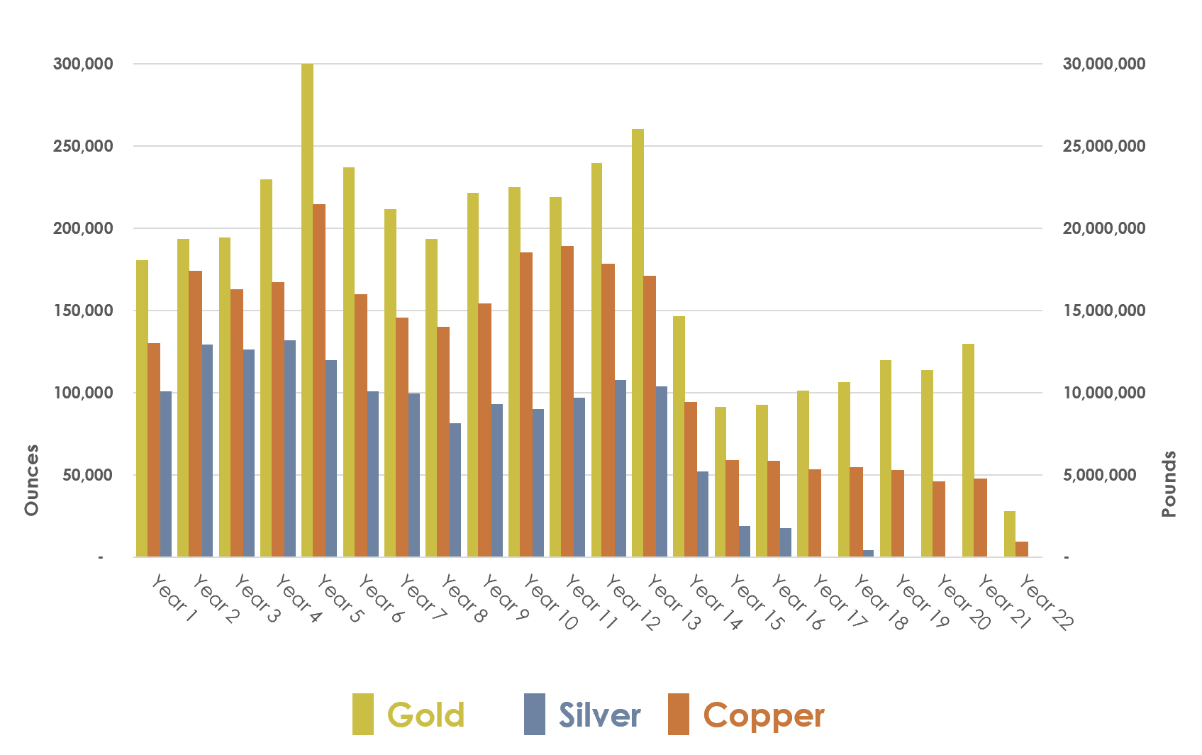 La production d’or projetée s’établit en moyenne à 220 000 onces par année pour les cinq premières années, à 246 000 onces par année pour les 14 premières années, et à 98 000 onces à compter de la 15e année. La quantité d’or payable prévue est de 3,8 millions d’onces, celle de cuivre de 265 millions de livres et celle d’argent de 1,5 million d’onces pour les 22 ans de vie de la mine.