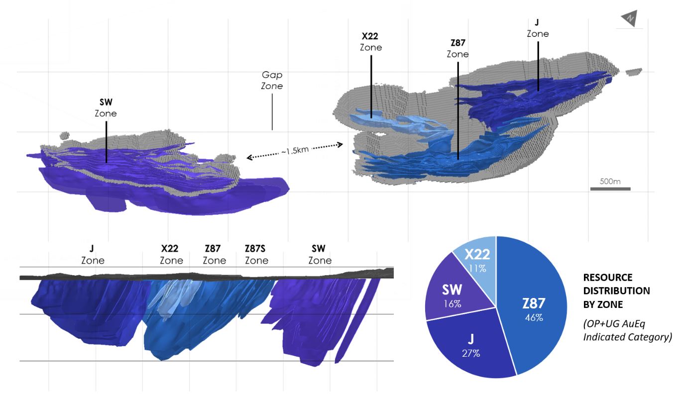 La zone Z87, la plus grande des deux fosses anciennement exploitées, a contribué à hauteur de 5,04 Moz d’équ.-or (197,1 Mt à 0,8 g/t d’équ.-or), soit environ 45 % des ressources minérales indiquées à ciel ouvert.