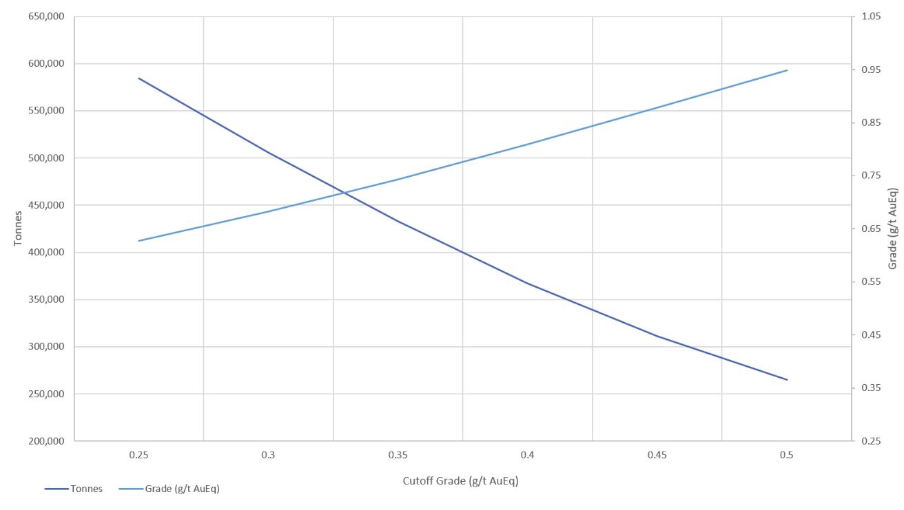 Le tableau de sensibilité de l’estimation des ressources minérales (voir tableau 4) montre le potentiel de ressources minérales à plus haute teneur pour des seuils de coupure plus élevés en équivalent-or.