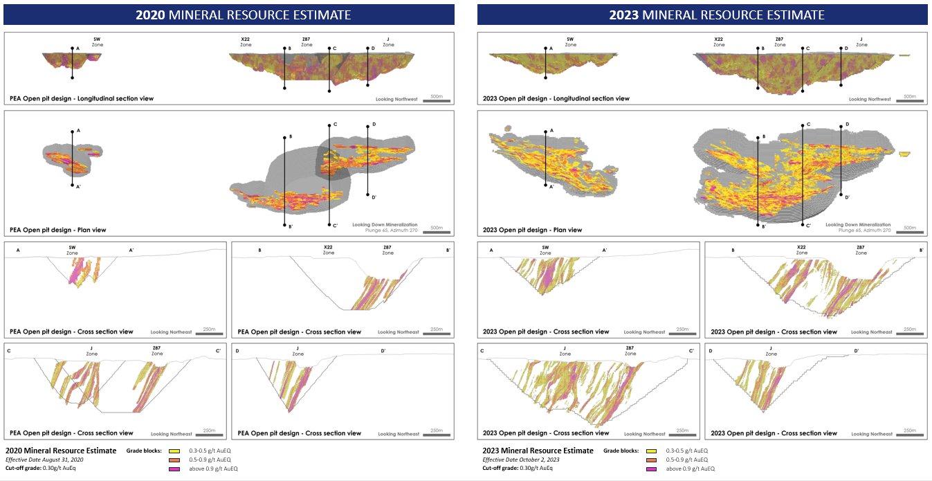 La combinaison de forages intercalaires à une densité de forage accrue et la découverte et l’expansion de deux nouvelles zones minéralisées ont entraîné une augmentation de 126 % des ressources minérales indiquées par rapport à l’estimation des ressources minérales de 2020 et une conversion de ressources présumées (estimation des ressources minérales de 2020) en ressources indiquées (estimation des ressources minérales de 2023) de près de 100 %. Les estimations des ressources minérales de la zone Z87, du secteur J et du secteur sud-ouest contiennent à la fois des ressources minérales à ciel ouvert et des ressources souterraines, tandis que la zone X22 contient uniquement des ressources minérales à ciel ouvert (voir tableaux 2 et 3).