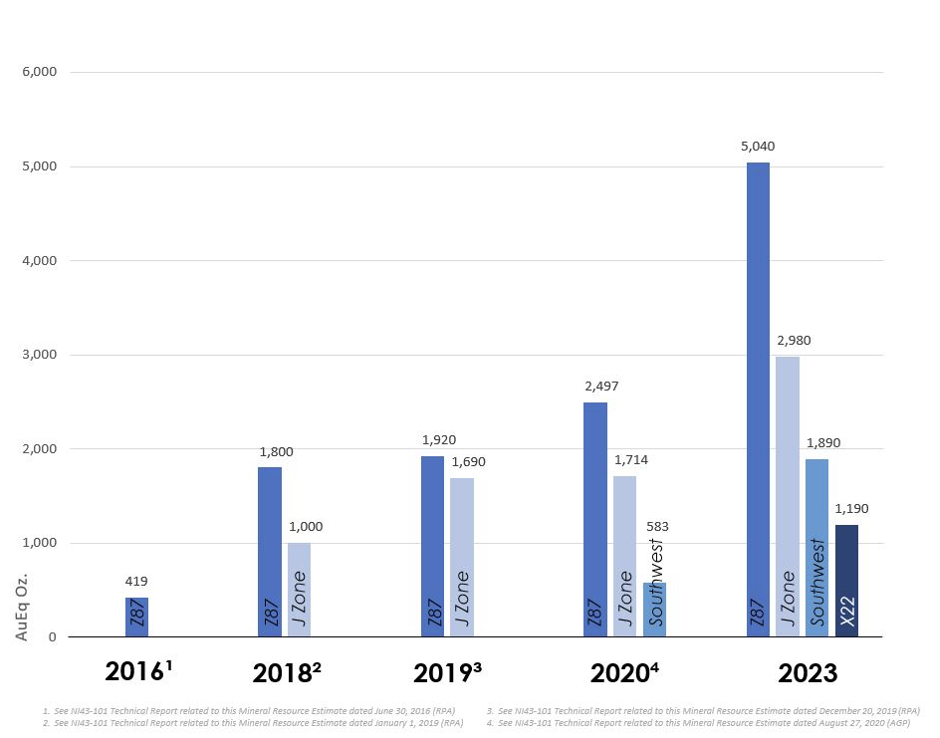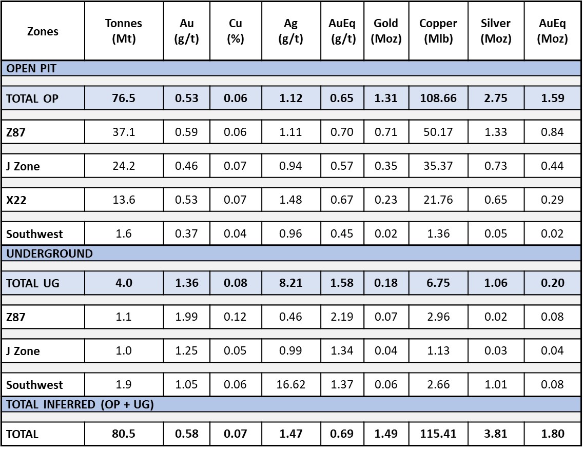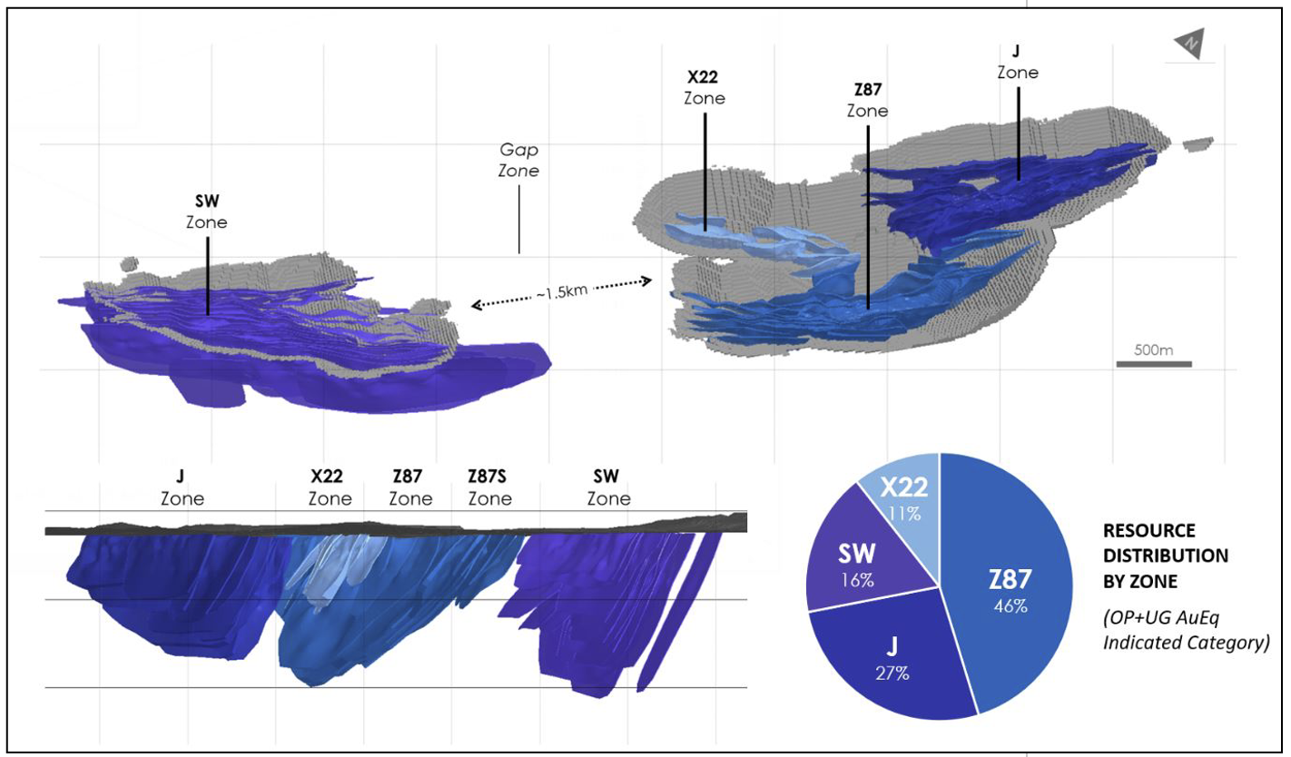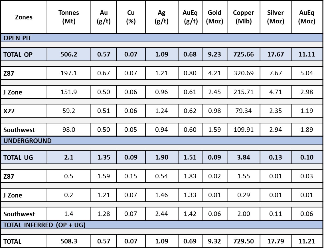 Les estimations des ressources minérales pour les zones Z87, J et Southwest comprennent des ressources à ciel ouvert et souterraines, tandis que la zone X22 contient uniquement des ressources minérales à ciel ouvert.