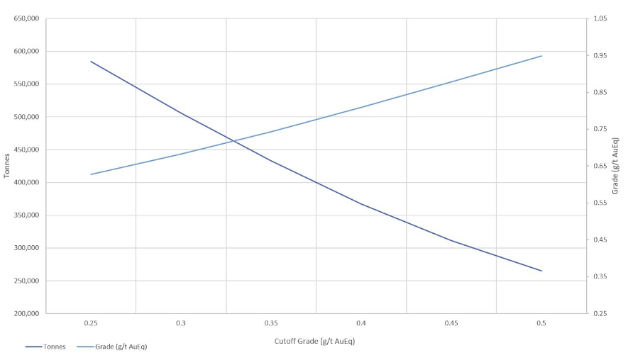 Le tableau de sensibilité suivant montre le potentiel de ressources minérales à plus haute teneur avec des seuils de coupure d’équivalent or plus élevés.
