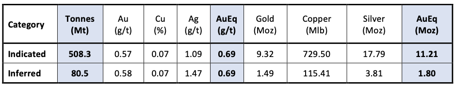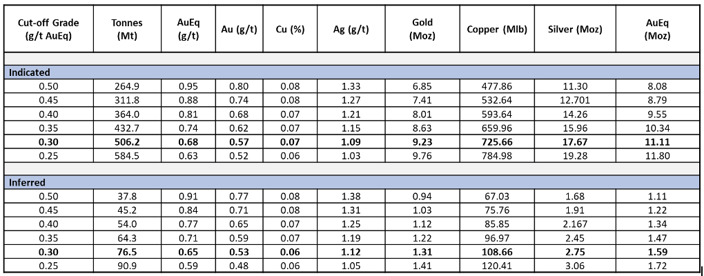 L'estimation des réserves minérales probables totalise 380 millions de tonnes, titrant 0,59 g/t d’équ-or (0,49 g/t Au, 0,058 % Cu and 1,0 g/t Ag) et contient 7,26 millions d'onces d'équivalent or (6,02 Moz Au, 484 Mlb Cu et 12,15 Moz Ag), reflétant la conversion réussie des ressources minérales indiquées et présumées.
